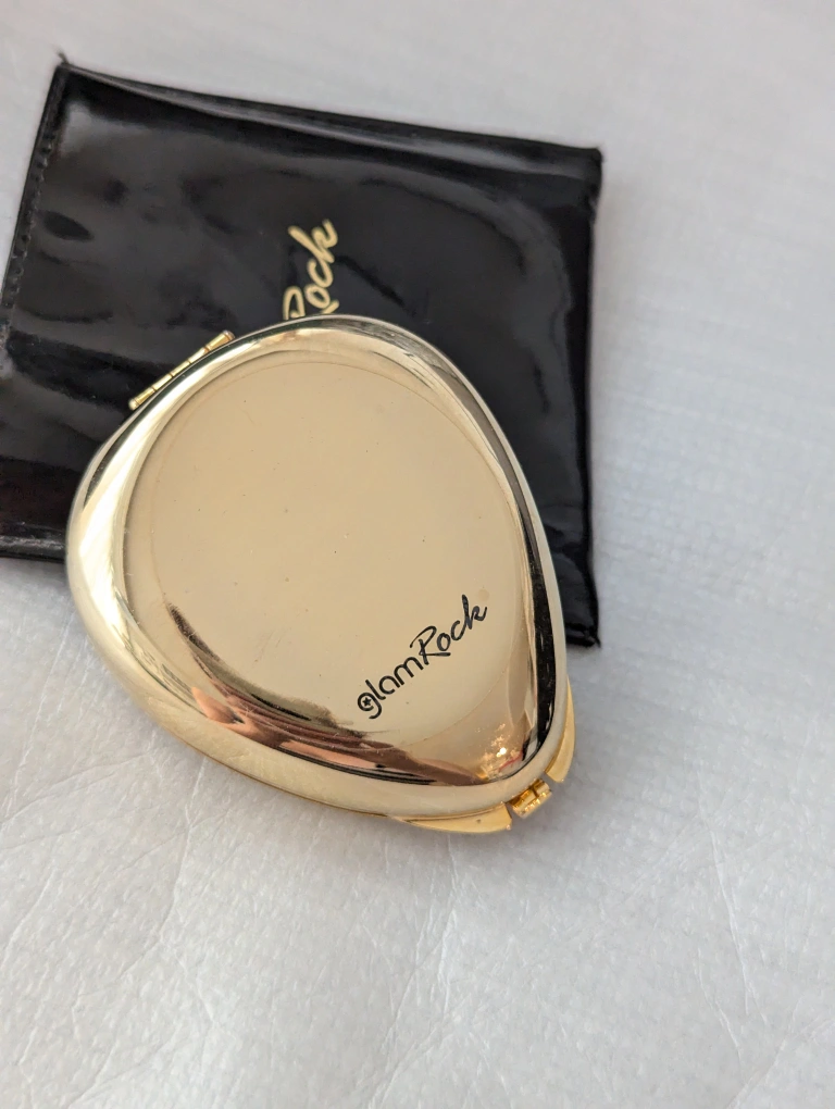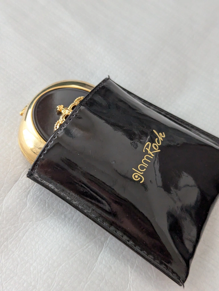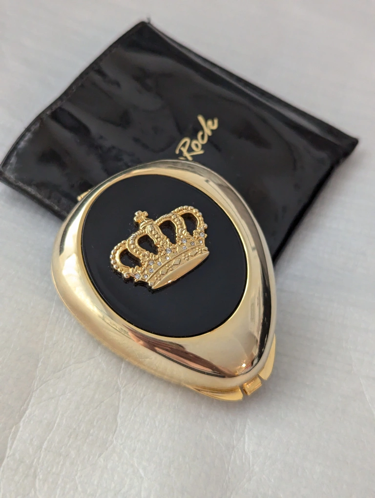 Gold pill box with black enamel centre and crown ornament. Comes with original black pouch with Glam Rock written on it.