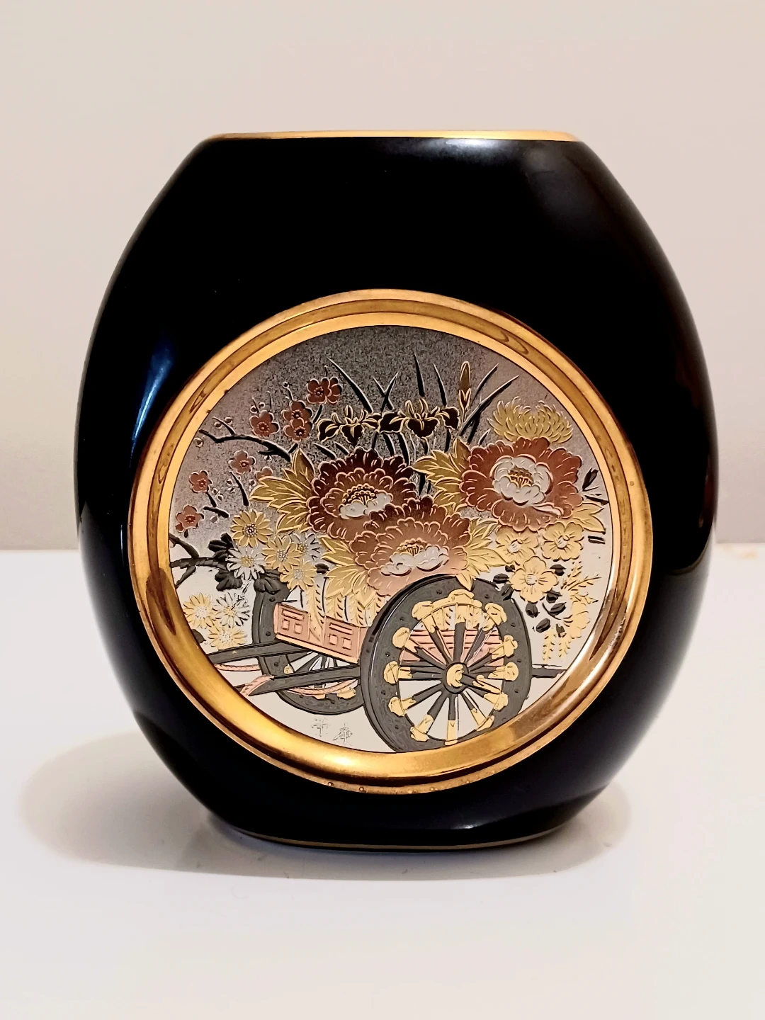 The central design features a traditional floral cart (or wagon) overflowing with flowers, created using the ancient art of Chokin. This technique involves engraving copper and then gilding it with gold and silver