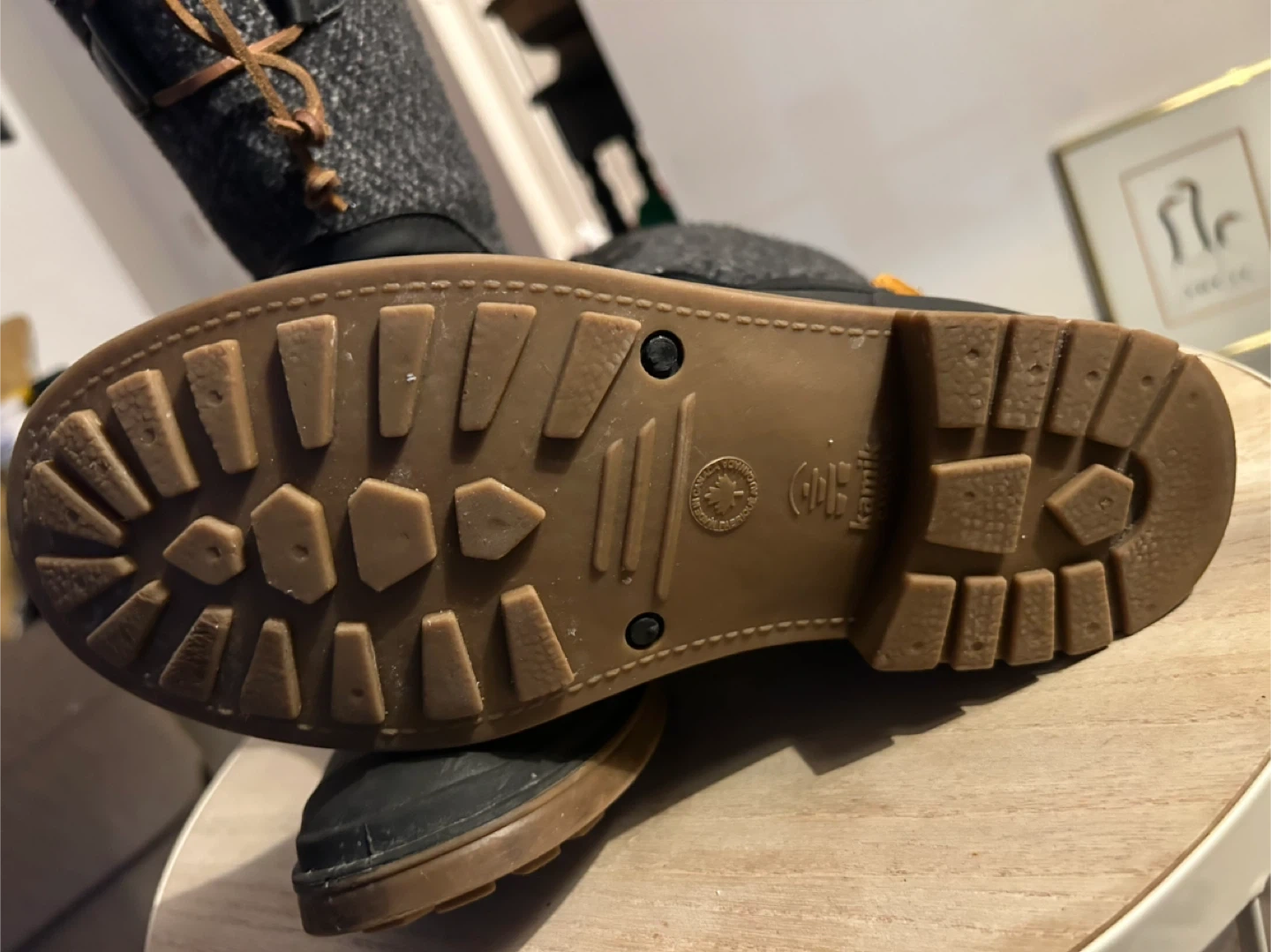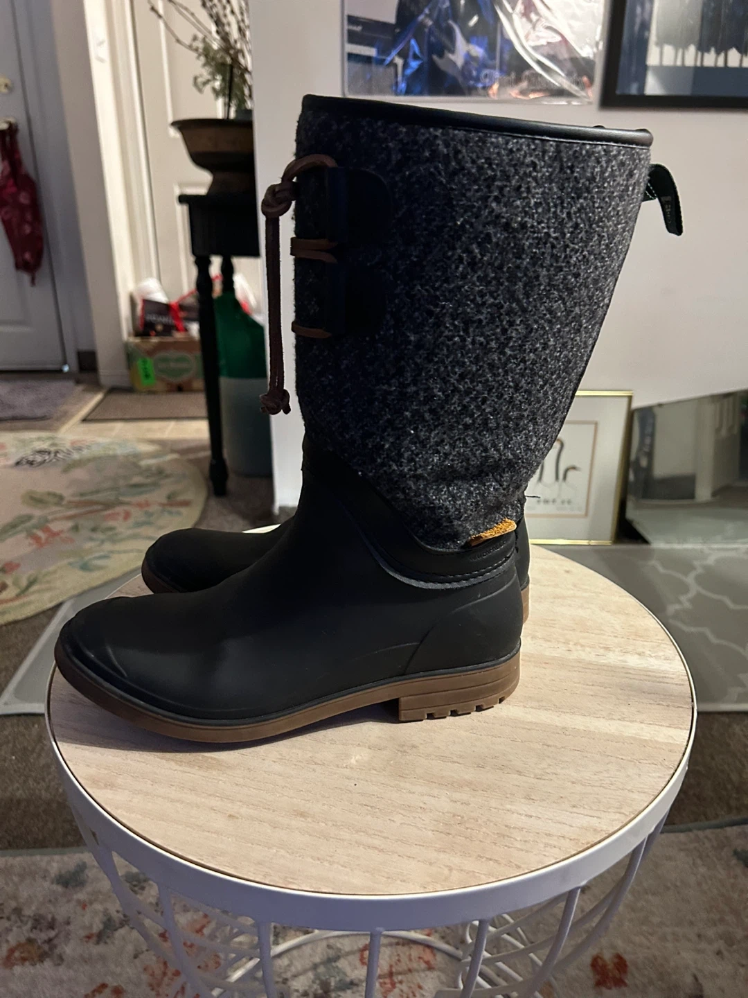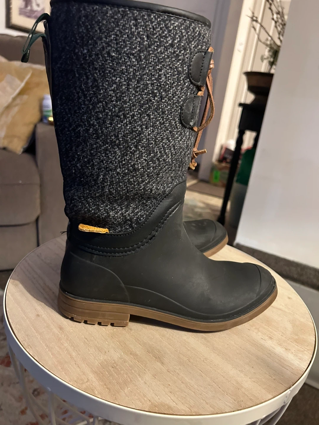 These Kamik boots are designed for warmth and comfort. They feature a durable rubber lower with a cozy knit shaft and faux leather accents. The treaded sole provides good traction. Great for keeping your feet warm on chilly days!