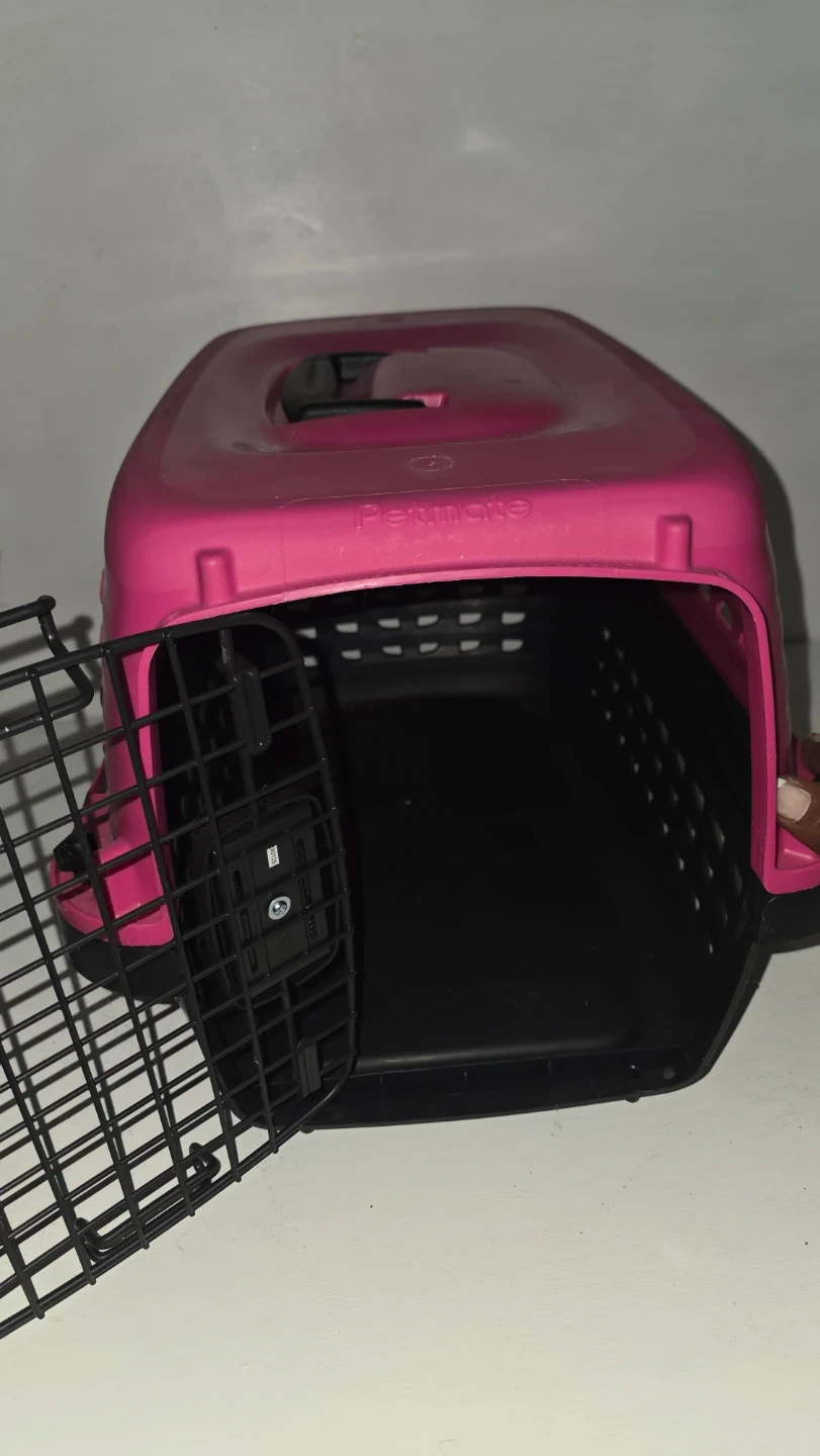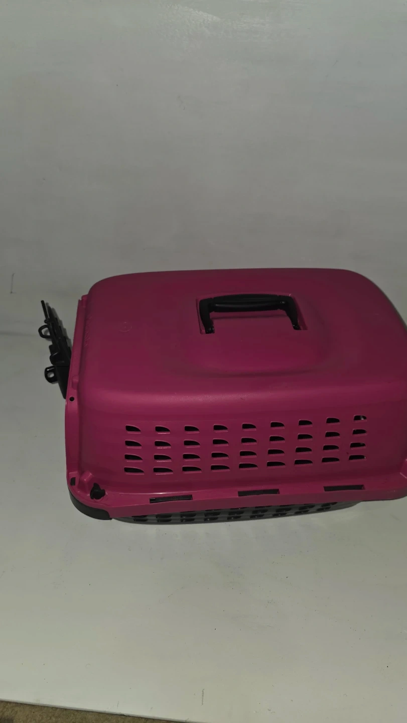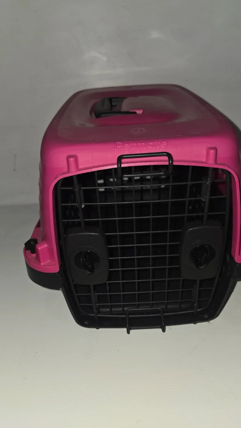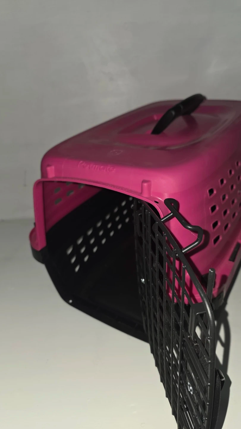 Petmate carrier in a bright pink colour. Features a secure wire door and ventilation slots. Plastic construction for easy cleaning.