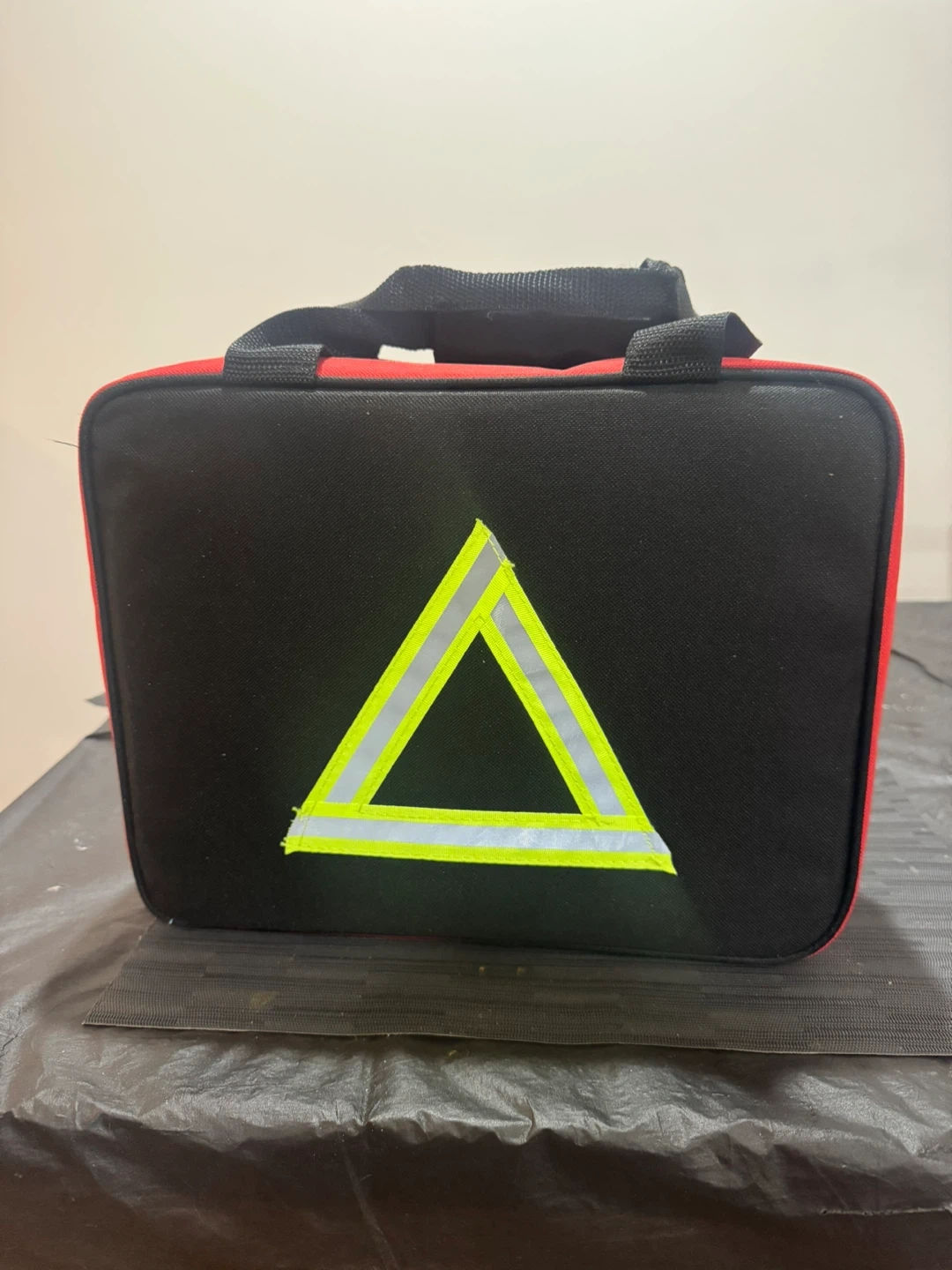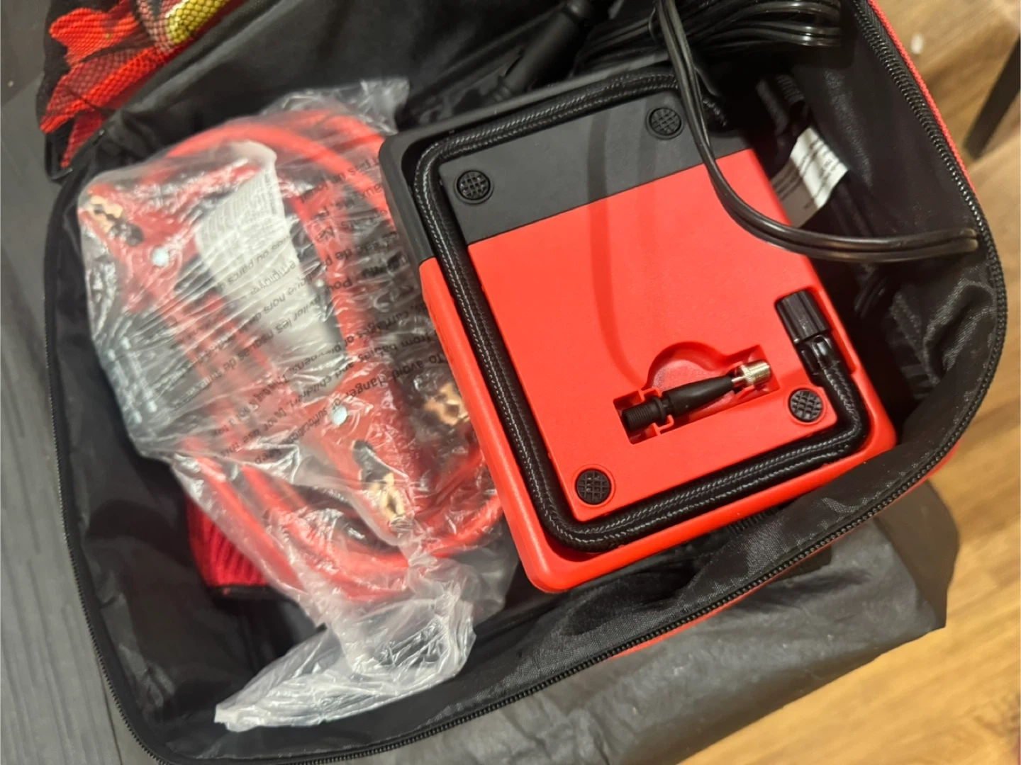 Selling an Auto Ready car emergency kit. It includes jumper cables, an air compressor, and a reflective safety triangle. Great to keep in your car for emergencies!