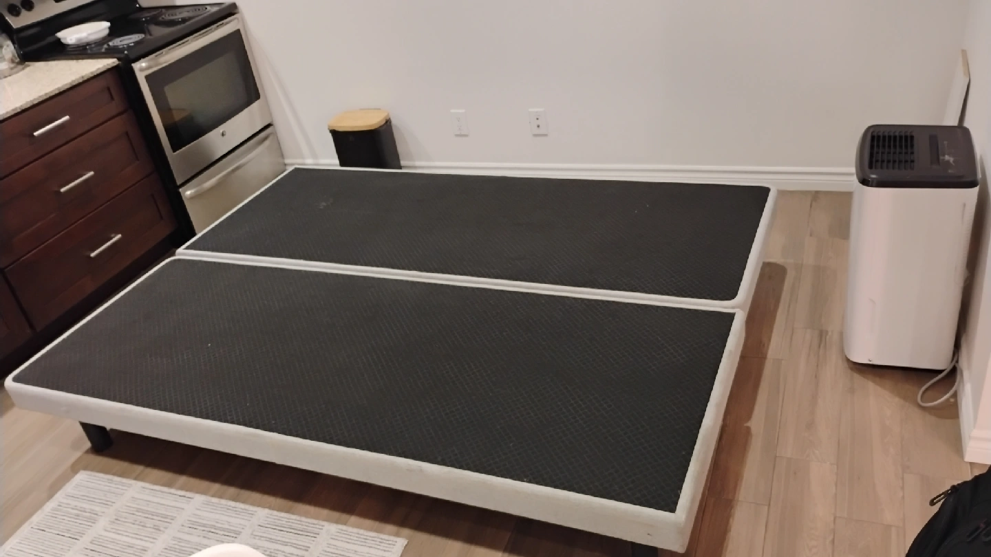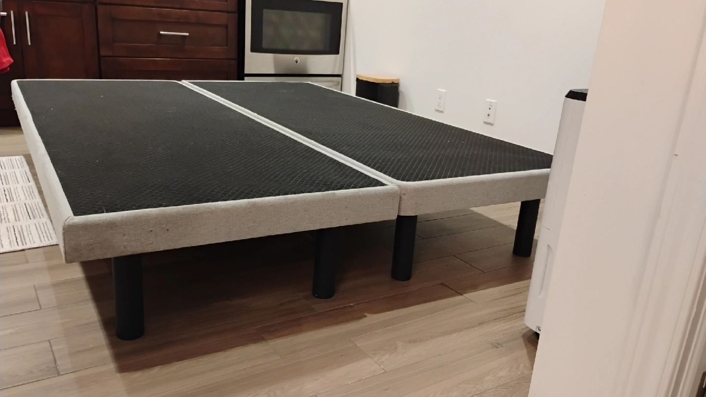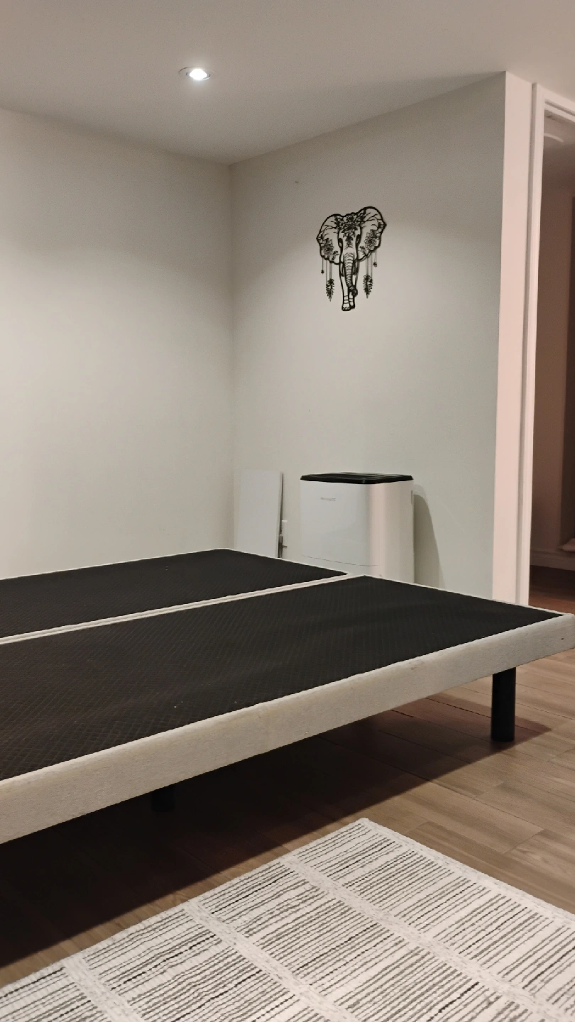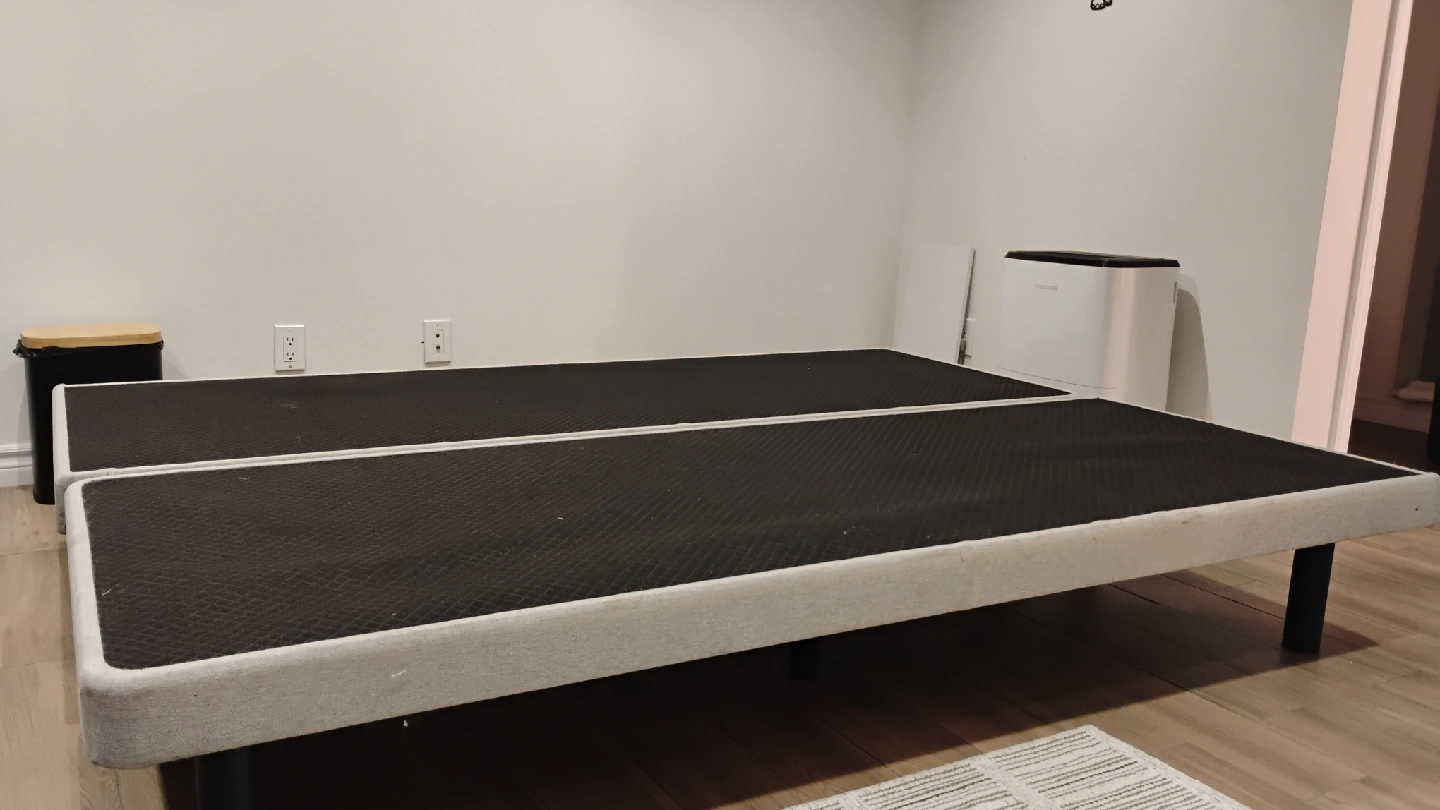 Selling a grey color queen size bed platform Base, minimalist design. It's in great condition. it comes with 2 separate pieces. No need for spring box. Just put your mattress directly on it.