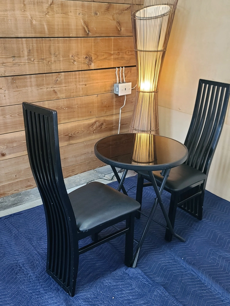 Selling a cute little black table with two matching chairs! It's perfect for a small space or a cozy breakfast nook. The chairs have a unique, stylish design with sleek lines. The table is round and foldable, making it easy to store when not in use. This set would be a great addition to any home!