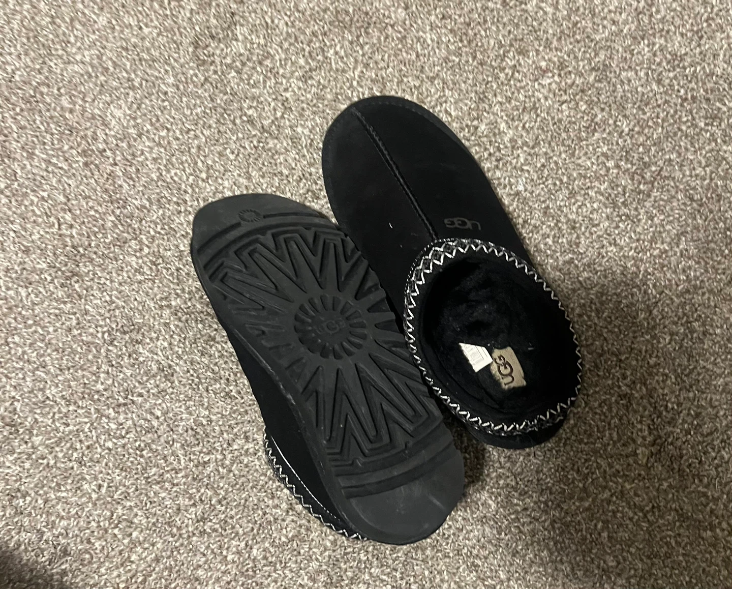 UGG Tasman II slippers in black. These comfy slip-on shoes are made with a cozy lining and a durable sole. Perfect for lounging around the house! Size 7.5