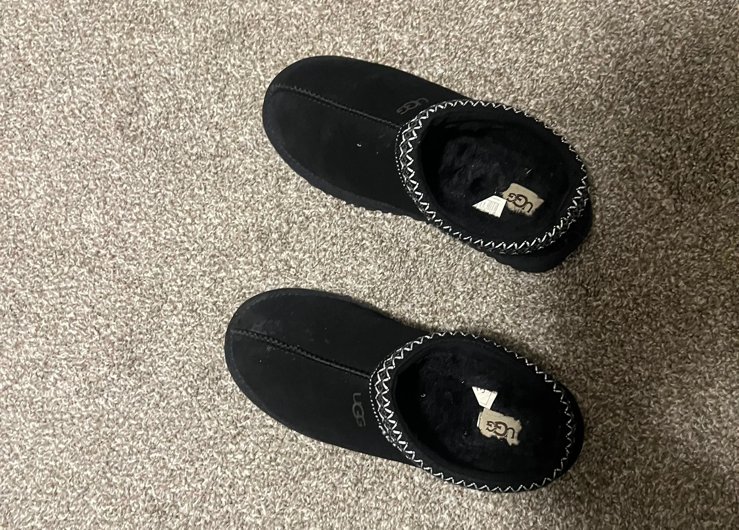 UGG Tasman II slippers in black. These comfy slip-on shoes are made with a cozy lining and a durable sole. Perfect for lounging around the house! Size 7.5