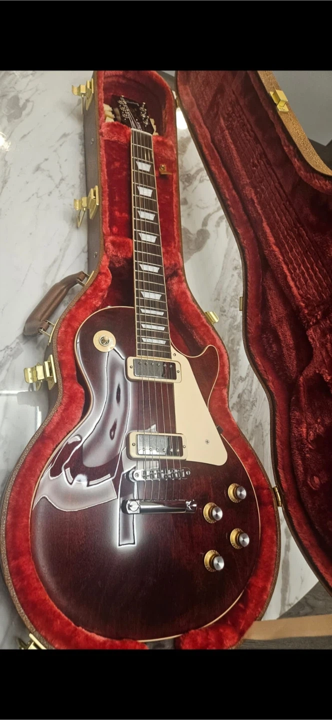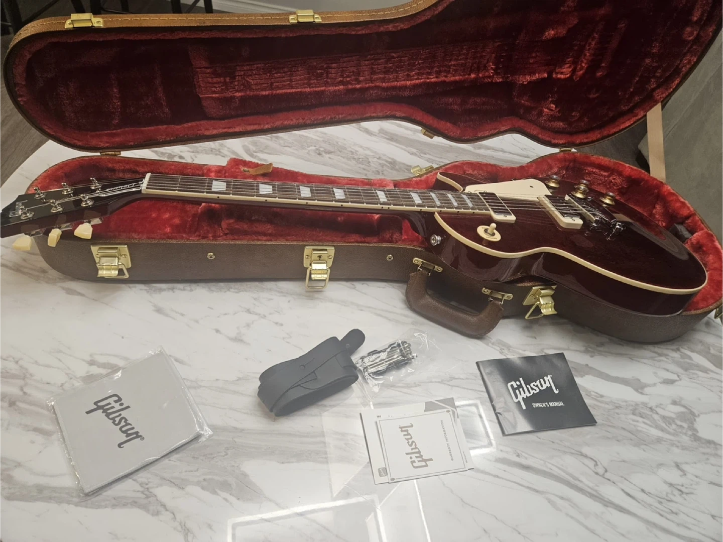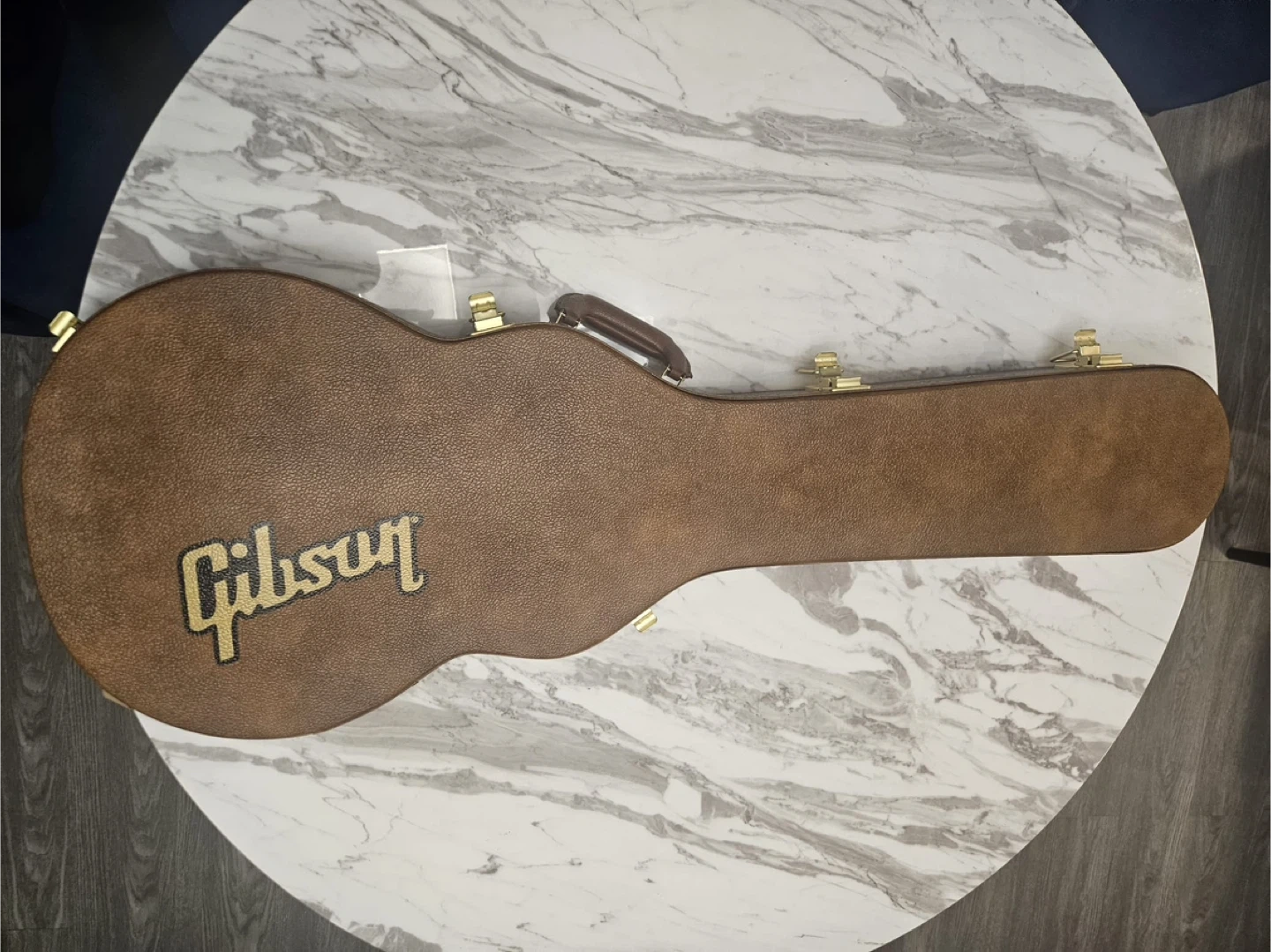 It's a Gibson Les Paul electric guitar in a classic brown hardshell case. The case features a plush red interior and gold latches. Includes Gibson care kit, warranty, and owner's manual. This instrument is ready for any gig or recording session!