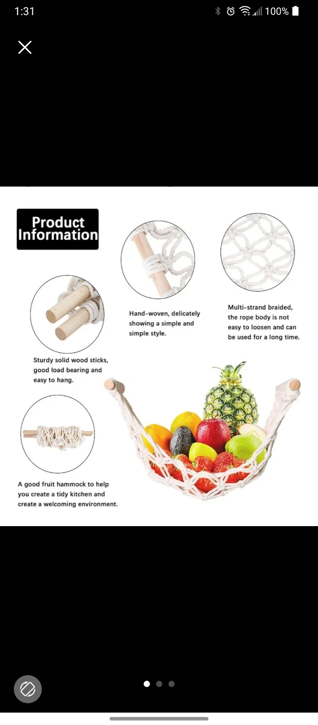 This hammock features hand-woven macrame with multi-strand braided rope. It includes sturdy solid wood sticks for hanging, offering a simple and stylish way to tidy your kitchen. This is great for storing fruits and vegetables in the kitchen, but also for toys in bedrooms, or even a stylish hangout spot for your cat or plants. Comes with the necessary hooks for hanging.