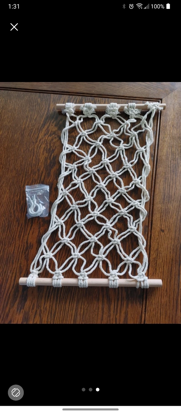 This hammock features hand-woven macrame with multi-strand braided rope. It includes sturdy solid wood sticks for hanging, offering a simple and stylish way to tidy your kitchen. This is great for storing fruits and vegetables in the kitchen, but also for toys in bedrooms, or even a stylish hangout spot for your cat or plants. Comes with the necessary hooks for hanging.