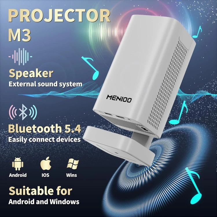 Selling a MENIOO M3 projector! It features Bluetooth 5.4 for easy device connections and supports 1080P native resolution. It's suitable for Android and Windows devices. It also has flexible connection options like USB, HDMI, Bluetooth 5.4, and WiFi