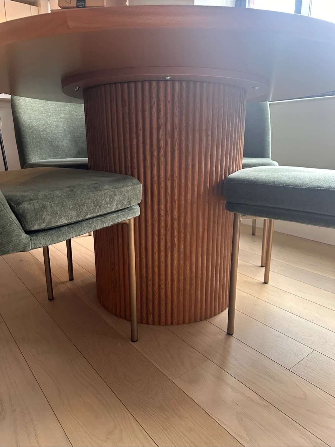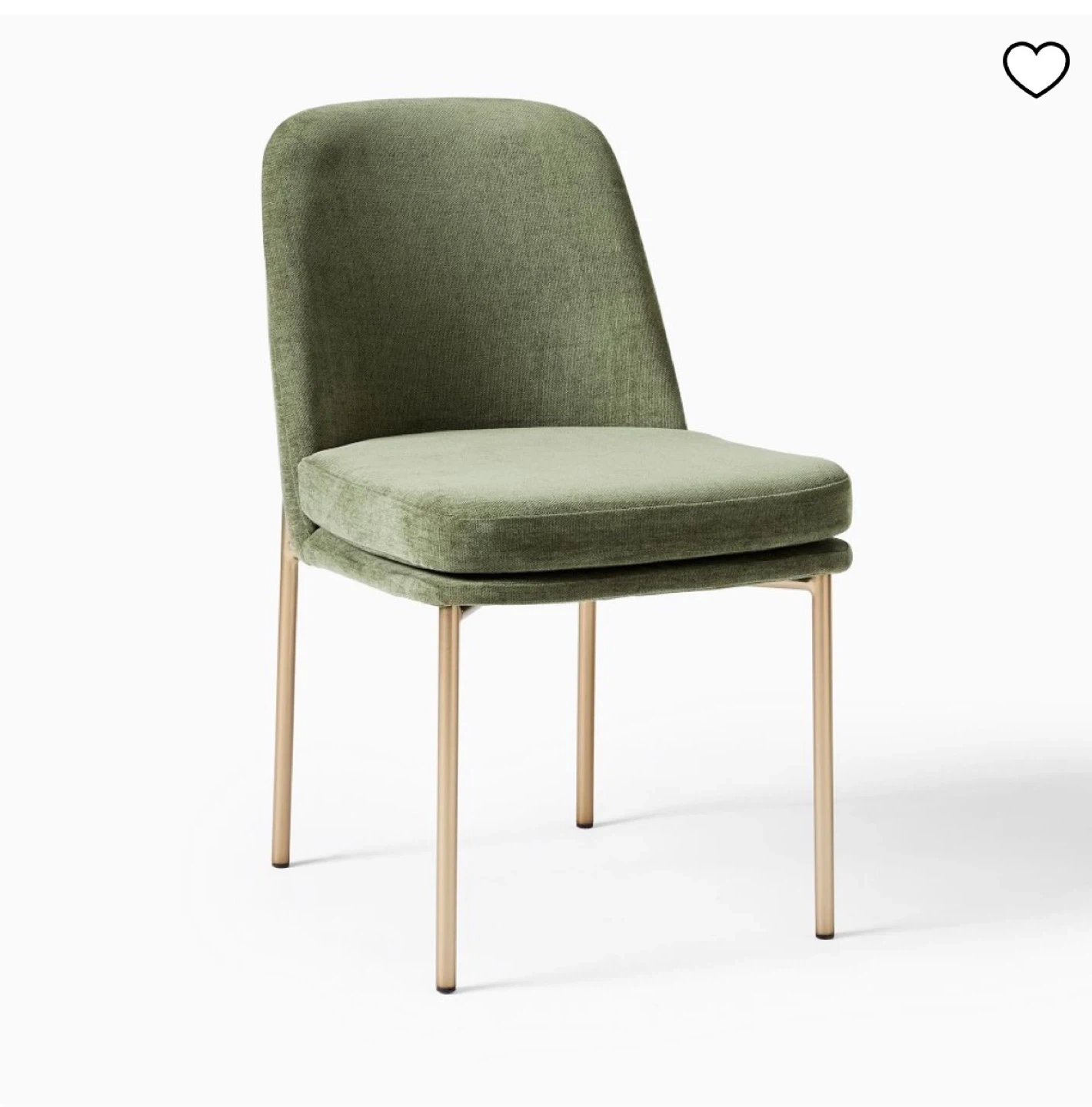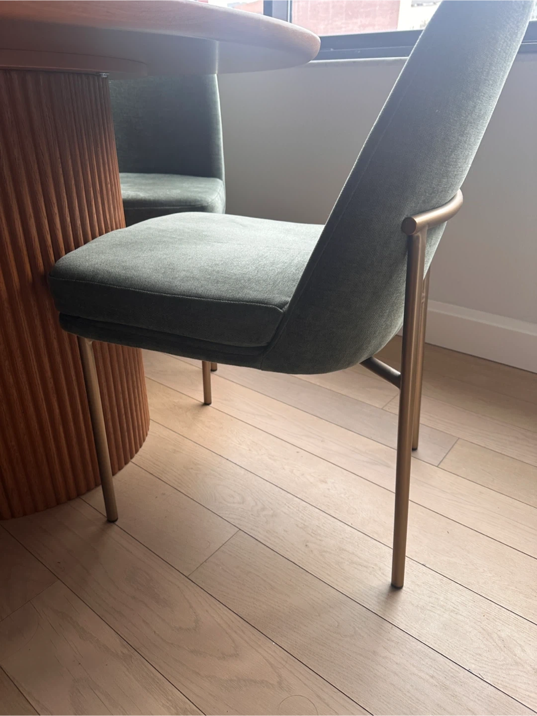 Circular dining table with dining chairs feature plush velvet upholstery in a muted green hue. Their slim, gold-toned metal legs add a touch of modern elegance. The seat and back are softly cushioned for comfort.