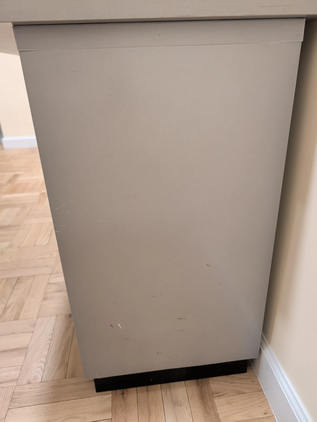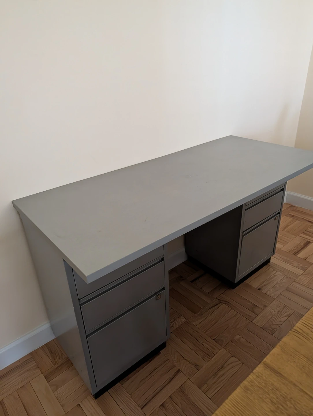 This is a large grey slab on top of 2 metal grey file cabinets. Each file cabinet has 2 smaller drawers above the filing part. They glide smoothly on metal runners. Great for an office or study area!