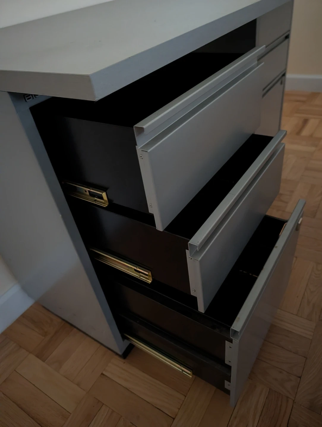 This is a large grey slab on top of 2 metal grey file cabinets. Each file cabinet has 2 smaller drawers above the filing part. They glide smoothly on metal runners. Great for an office or study area!