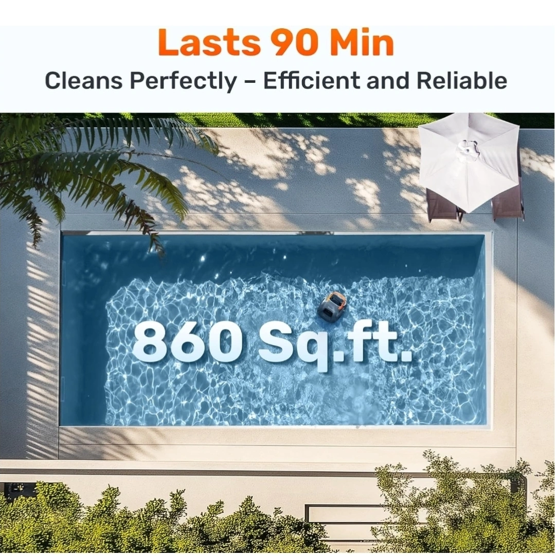 Smooth Glide, High-Efficiency: This robotic pool cleaner glides effortlessly for up to 90 minutes of continuous cleaning. Ideal for flat above-ground pools up to 860 sq. ft. It delivers a clean swimming pool with high efficiency.