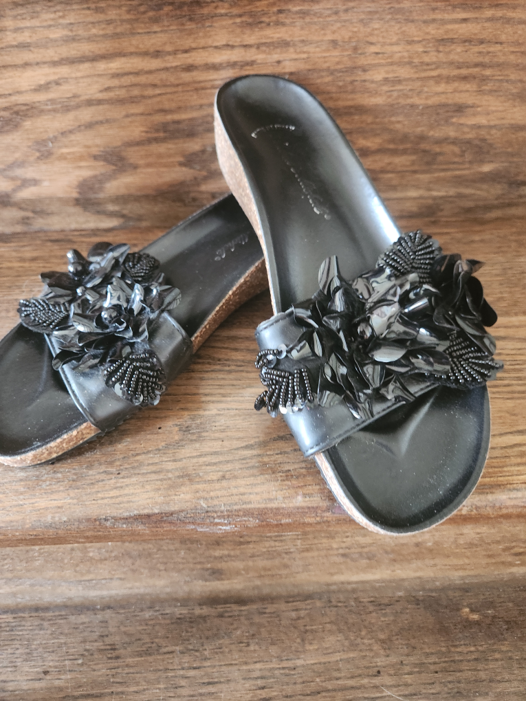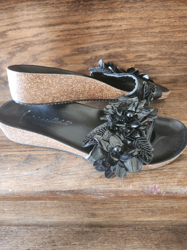 Cute black Italian sandals with a floral design. They're perfect for adding a touch of style to your summer outfits! Size 10.