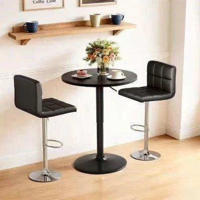 Adjustable height round bar table in black. It features a sturdy base and a durable, scratch-resistant surface. Perfect for a home bar or small kitchen space.