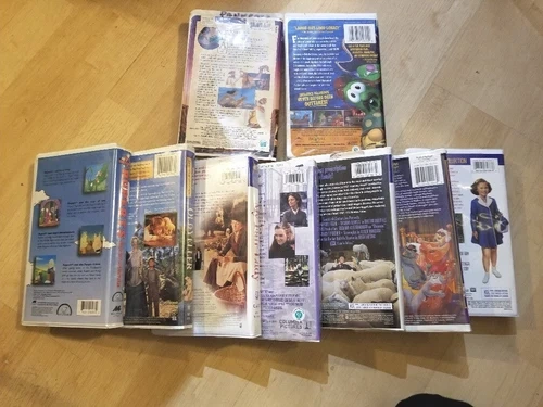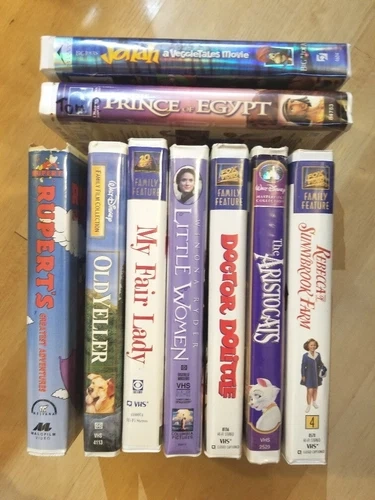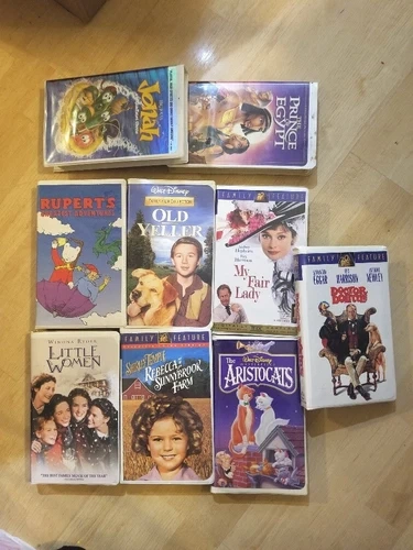 Here's a lot of 7 VHS tapes for kids, including Disney classics, plus 2 empty cases for Jonah and The Prince of Egypt. The tapes included are: Rebecca of Sunnybrook Farm, Little Women, Rupert's Greatest Adventures, My Fair Lady, Old Yeller, Doctor Dolittle, and The Aristocats. Let me know if you're interested!