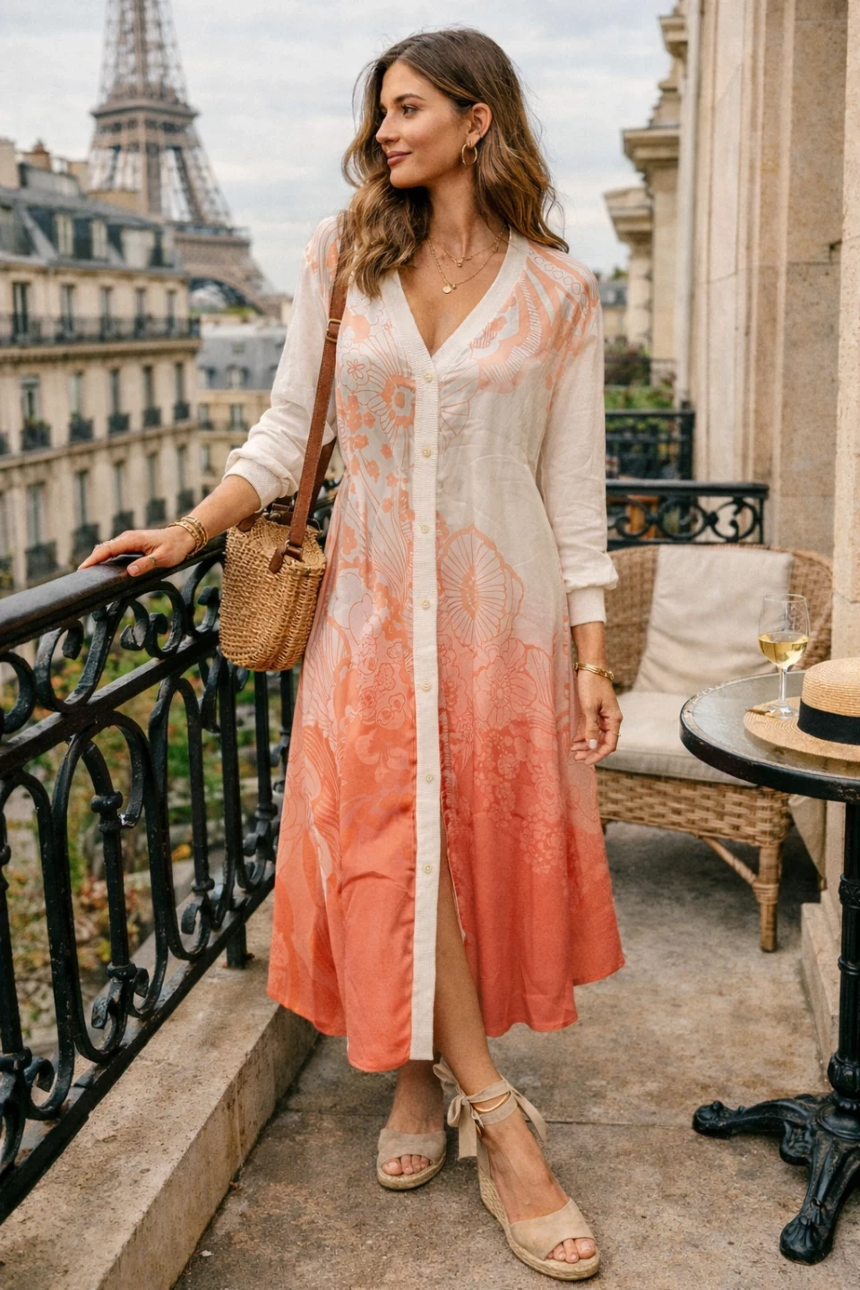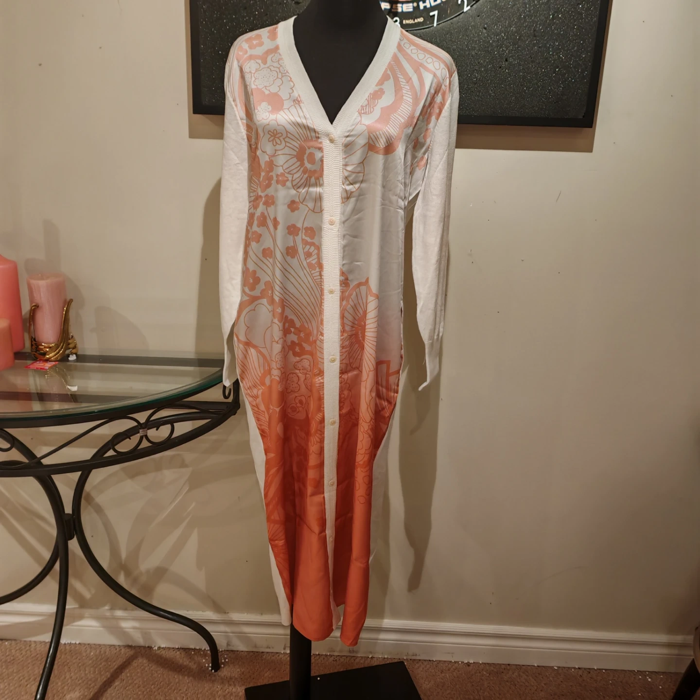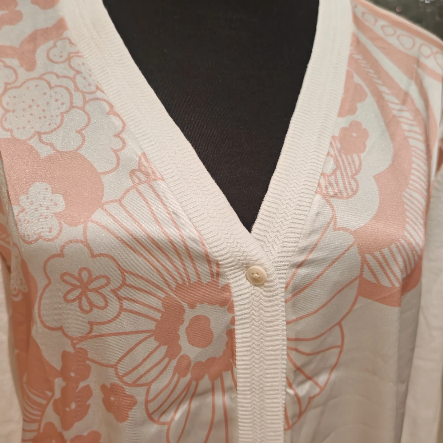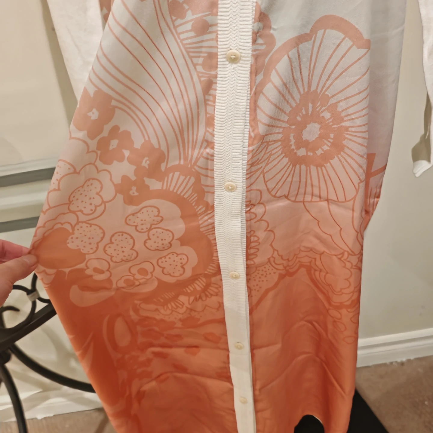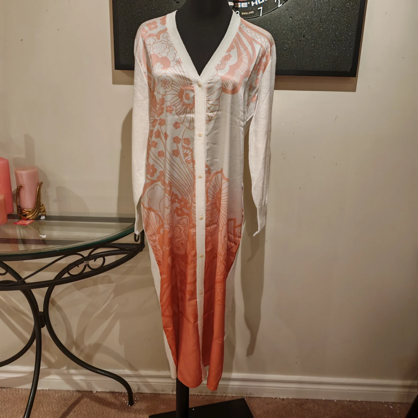 This is a Ted Baker London Rosmíry cardigan dress in white with a pink floral gradient print. The back and sleeves are 46% cotton, 33% linen, and the front panel is 100% polyester. It features a button-front closure and a V-neckline. Who would this be useful for? Someone looking for a stylish layering piece or a versatile dress.