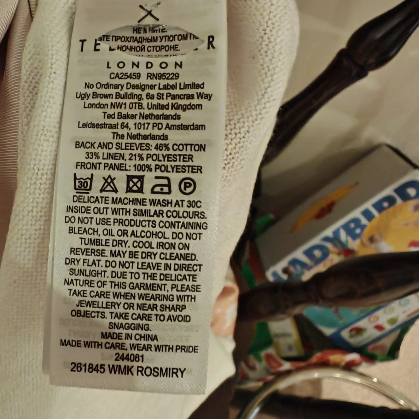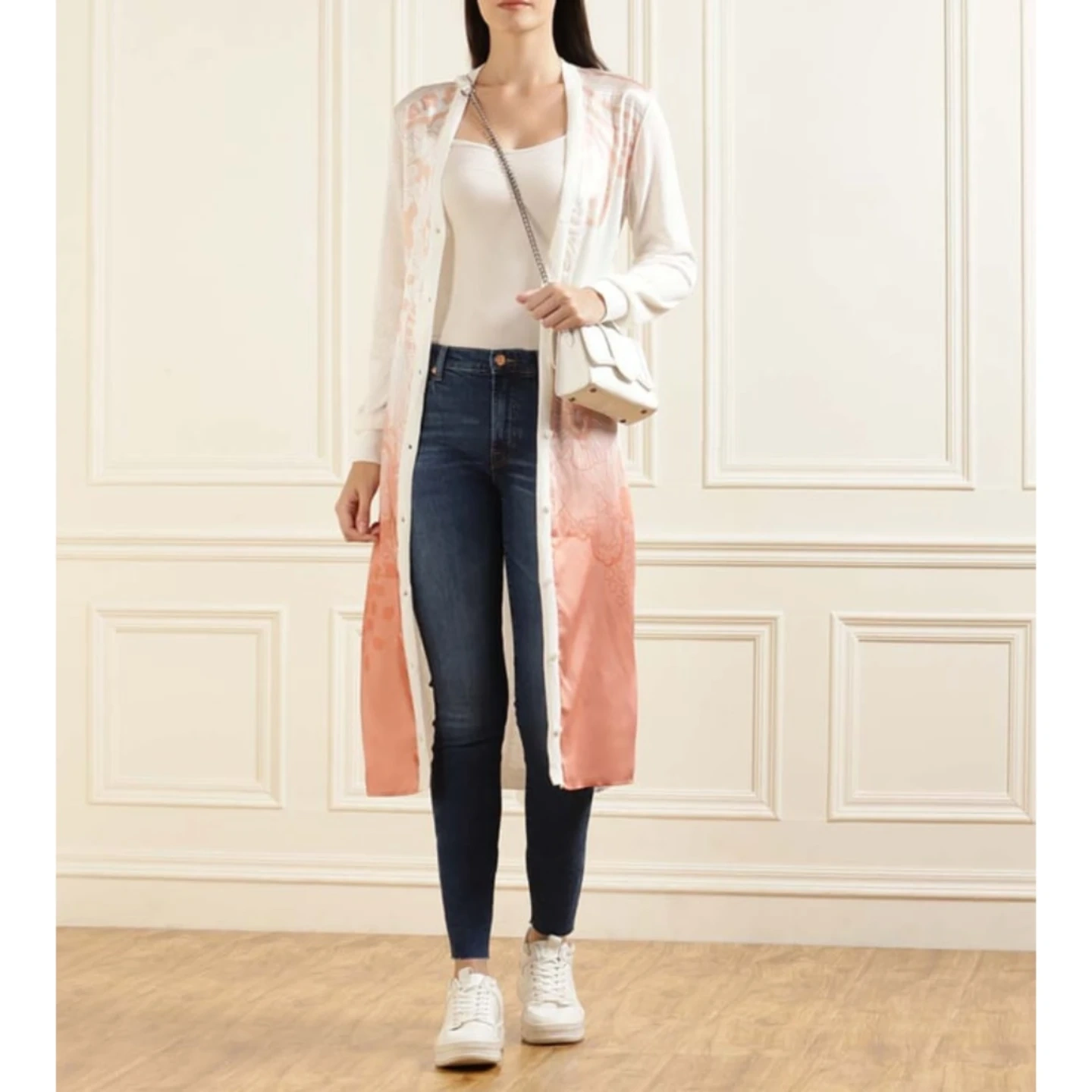 This is a Ted Baker London Rosmíry cardigan dress in white with a pink floral gradient print. The back and sleeves are 46% cotton, 33% linen, and the front panel is 100% polyester. It features a button-front closure and a V-neckline. Who would this be useful for? Someone looking for a stylish layering piece or a versatile dress.