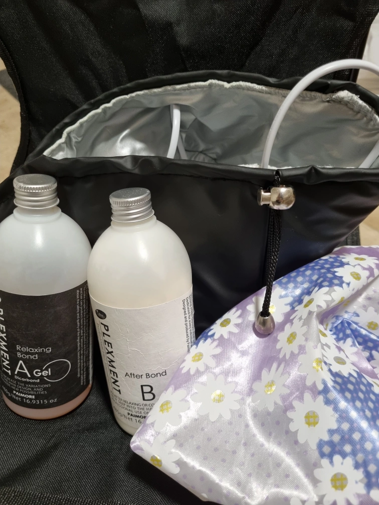 Two bottles of hair protein bond treatments with a shower cap and heat cap to use with it.