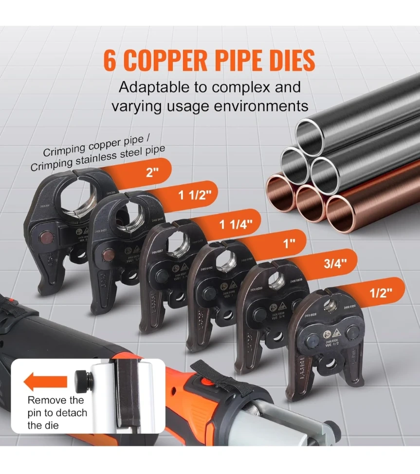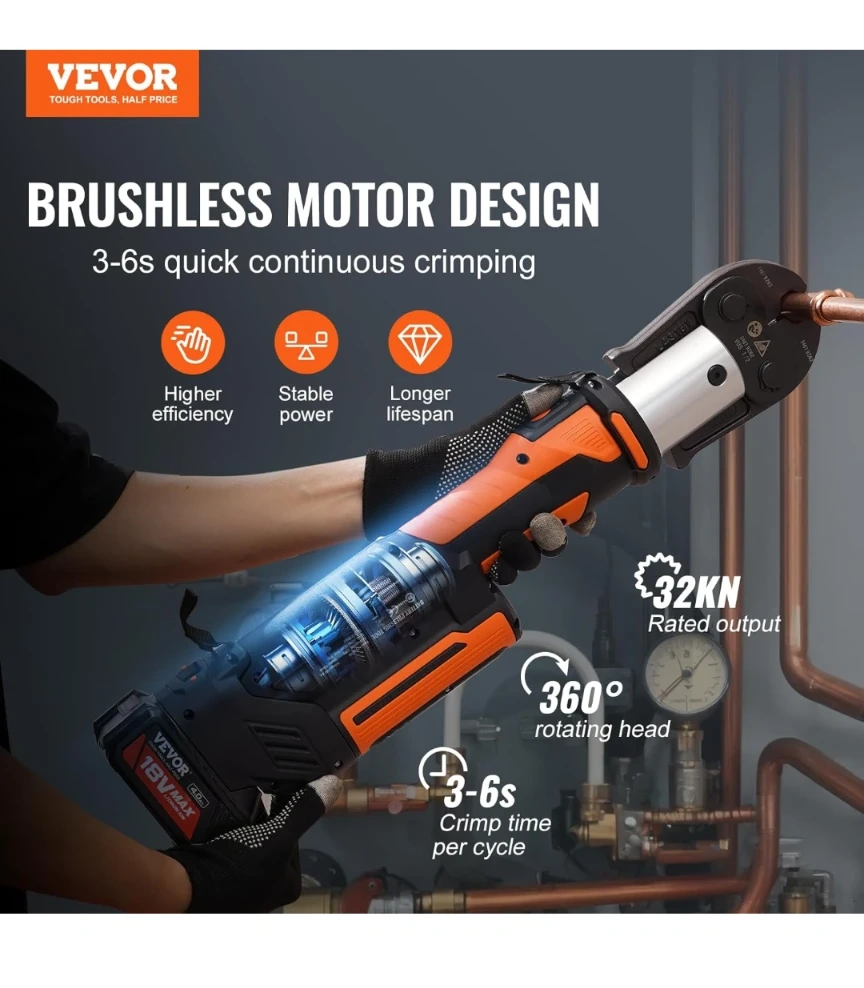 VEVOR electric pipe crimping tool kit. Includes a brushless motor press tool, two 18V batteries, a fast charger, and a carry case. Comes with 1/2", 3/4", 1", 1 1/4", 1 1/2", and 2" jaws.