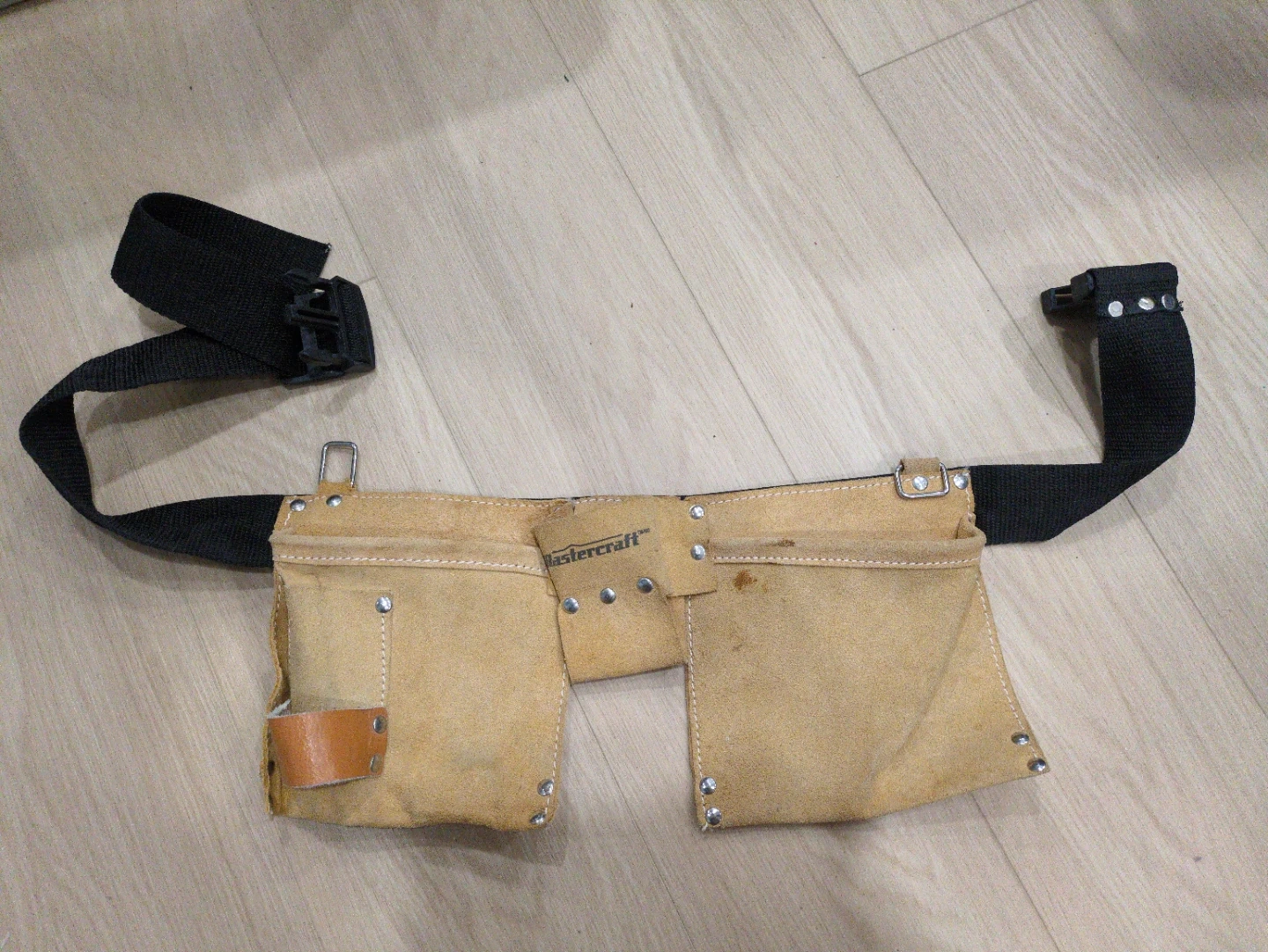 This is a Mastercraft suede tool belt with multiple pockets. It has a black adjustable nylon strap with a quick-release buckle. The belt features several pouches for organizing tools.