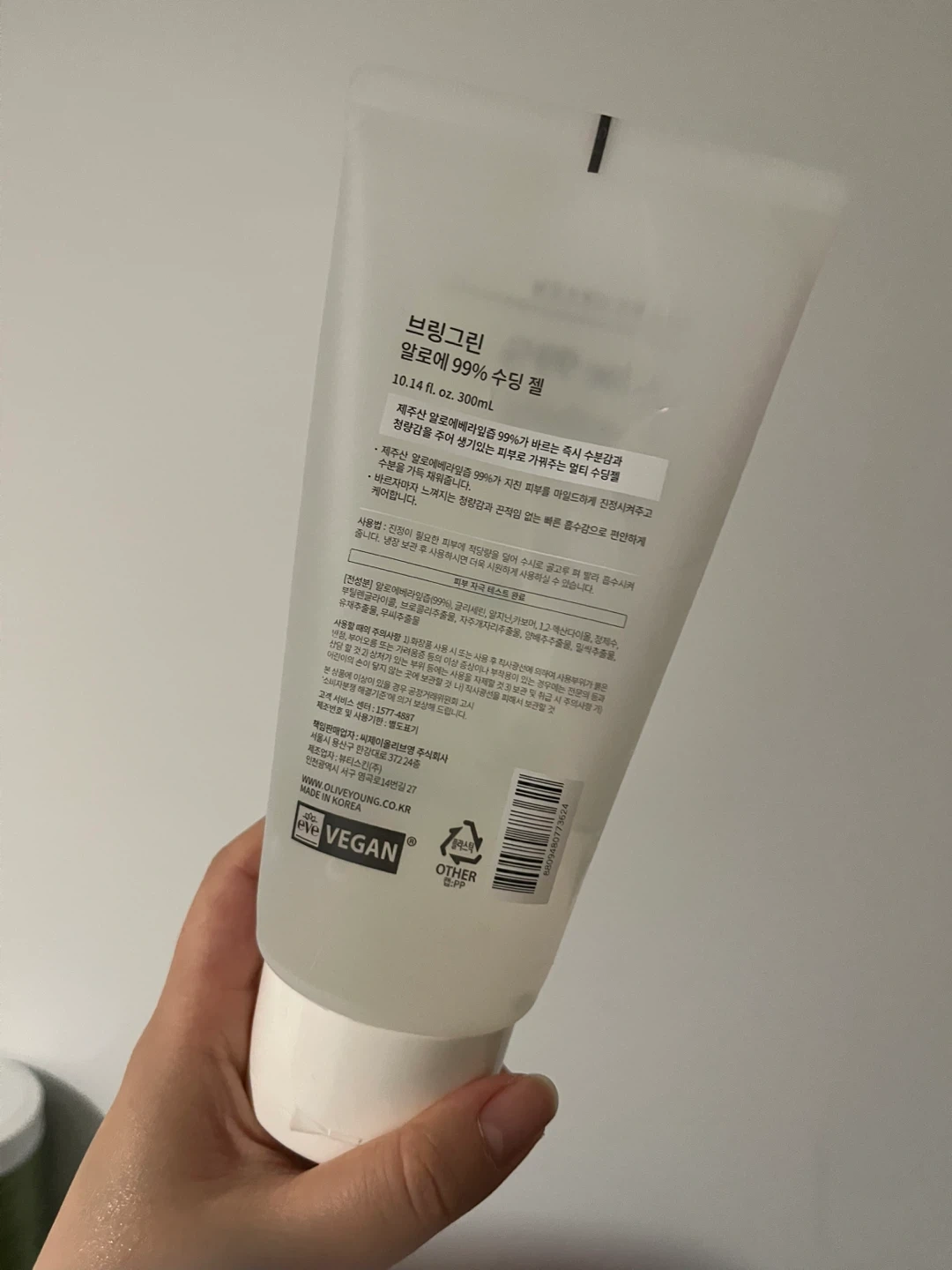 This gel has 99% aloe vera extract for soothing skin. It provides a cooling effect and hydration. Made in Korea.