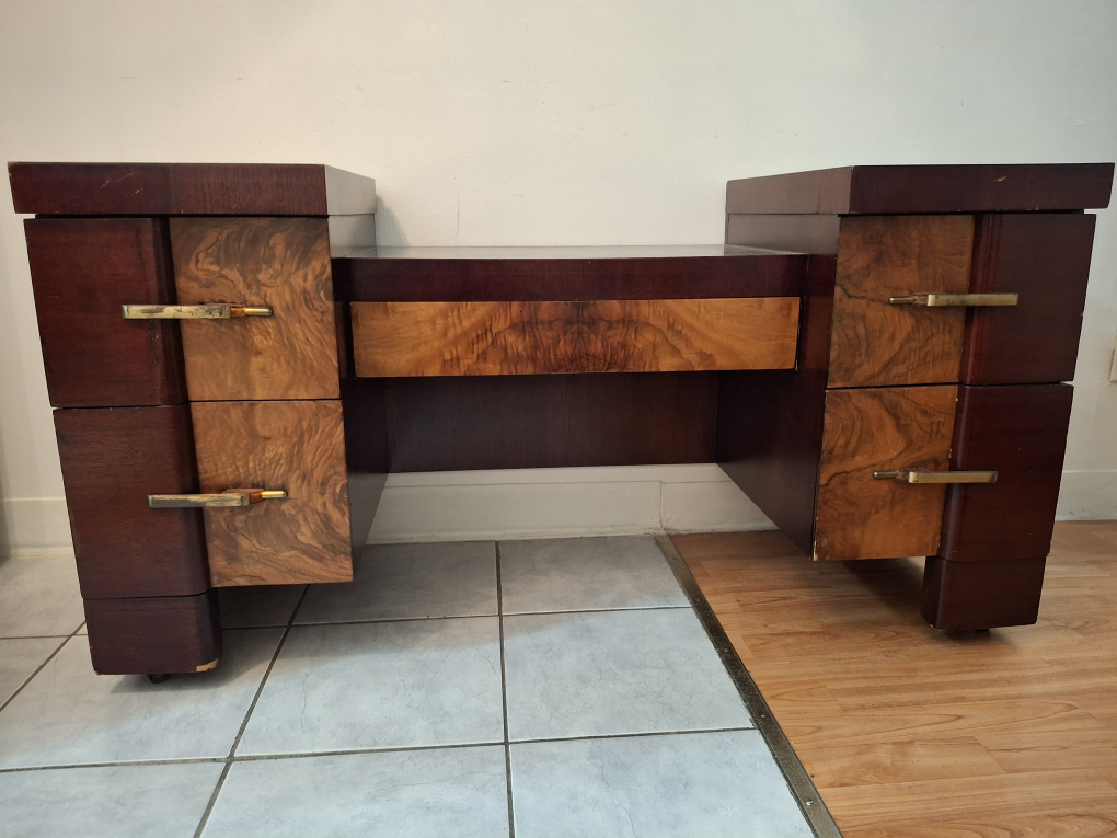 Charming Art Deco makeup vanity desk/dresser with chair. Brass handles with tool and die details. Circa 1930s Zolte's Better Furniture. This was originally from Poland. Shipped to the U.S. and now in Canada. It's absolutely beautifully.