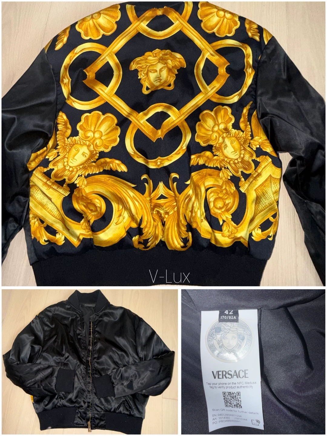Versace bomber jacket featuring a black satin exterior with a striking gold baroque print on the back. Includes a gold-tone zipper closure. Size 42.