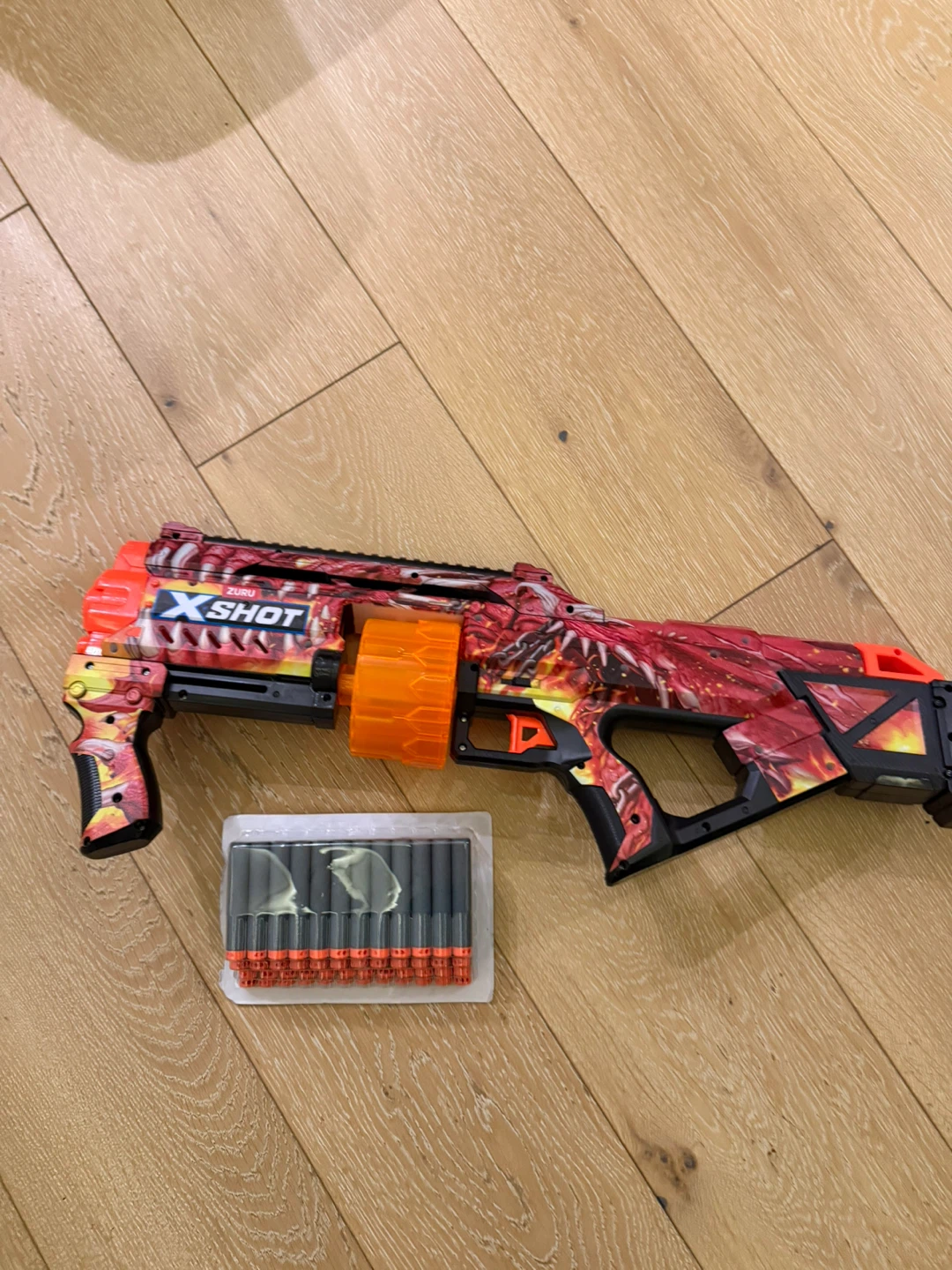 This X-SHOT blaster features a cool red and yellow dragon design. It includes a clip of darts for immediate play. Kids can have a blast with this toy!
