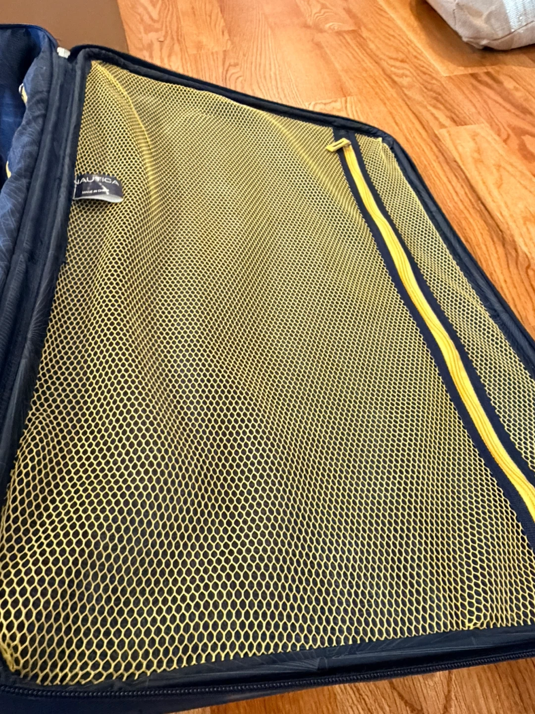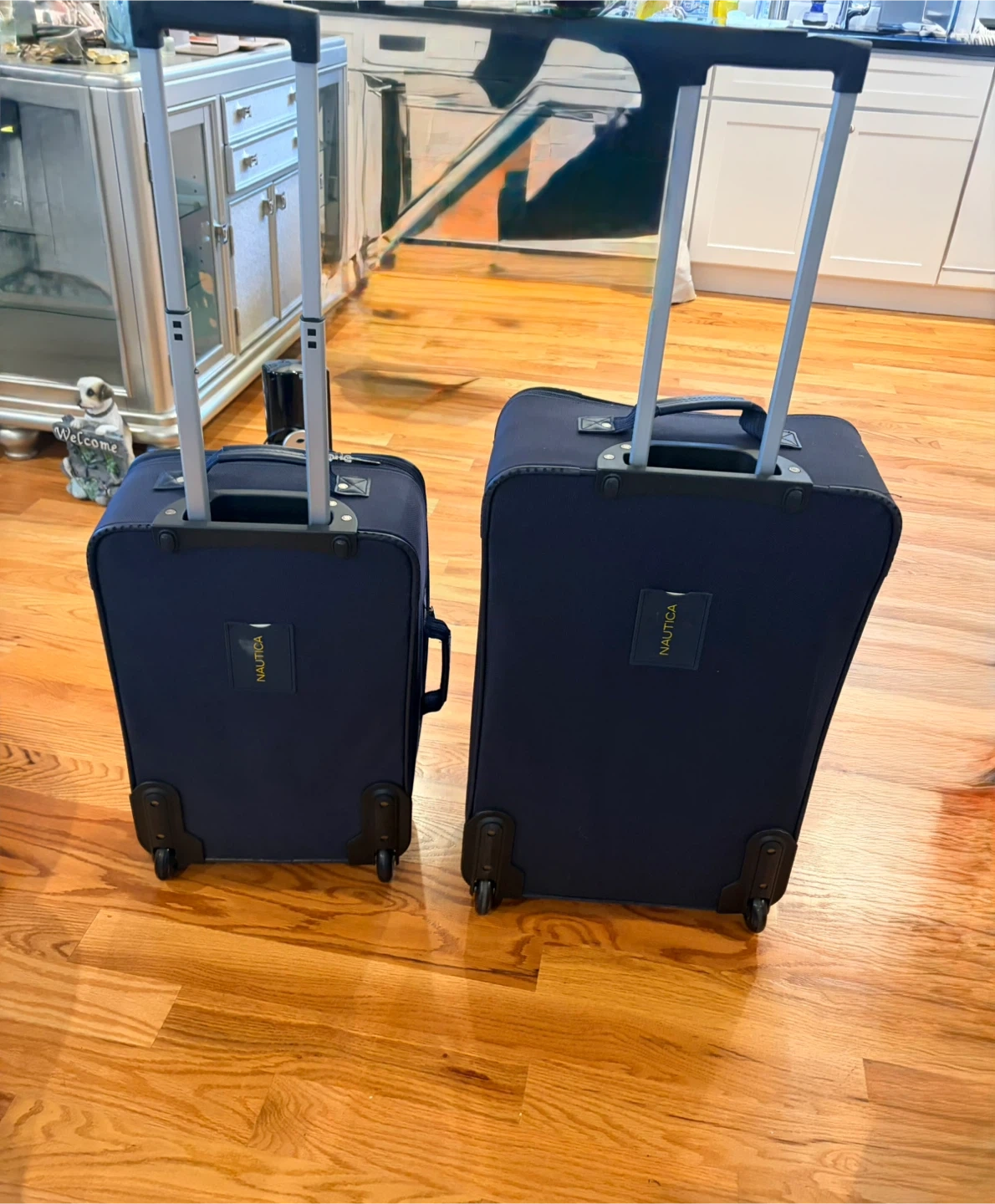 Two navy blue Nautica suitcases with yellow accents. Includes one large and one carry-on size. Both feature telescoping handles and wheels. Interior has mesh zippered compartments.