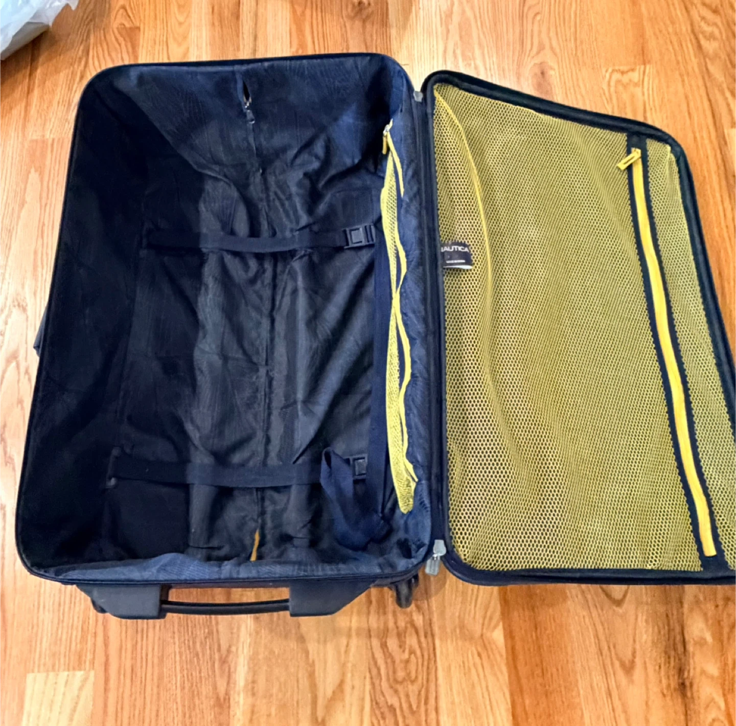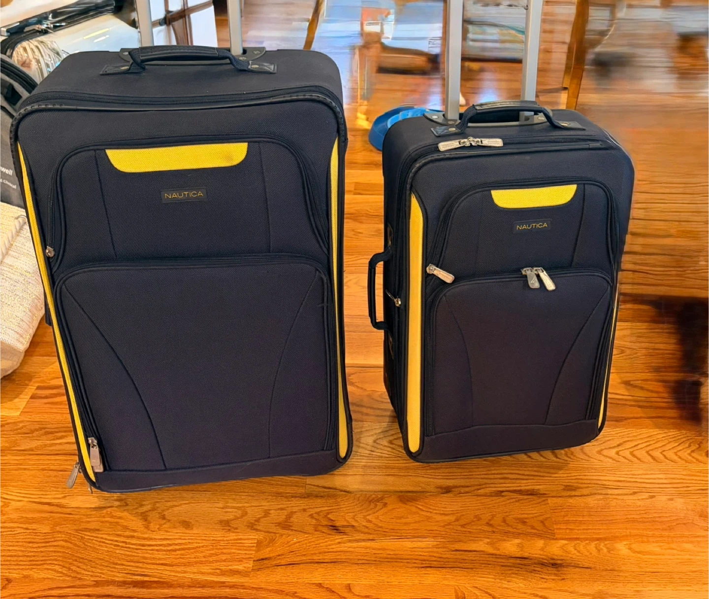 Two navy blue Nautica suitcases with yellow accents. Includes one large and one carry-on size. Both feature telescoping handles and wheels. Interior has mesh zippered compartments.