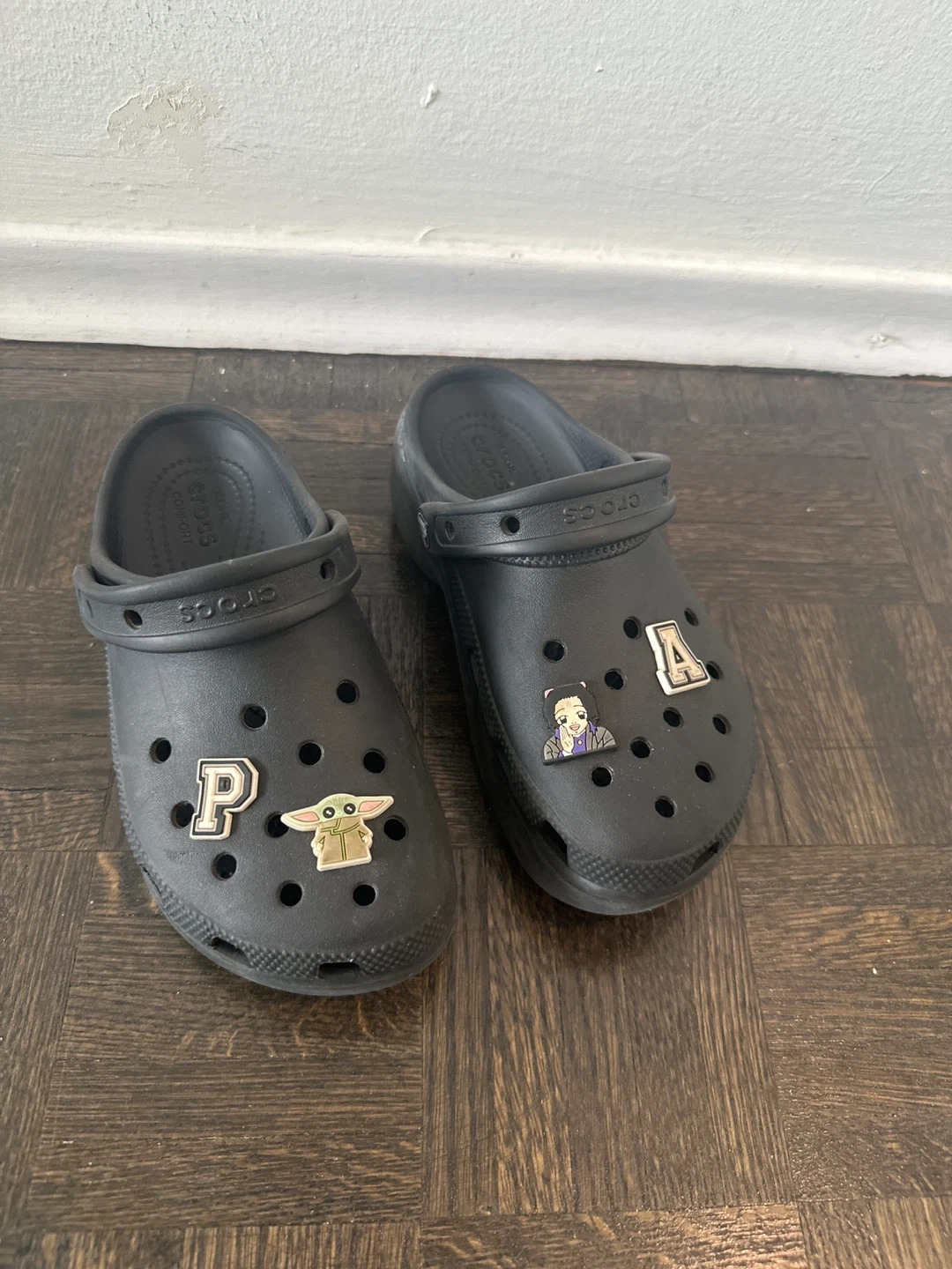 Black Crocs clogs in a women's size 6. They come with assorted Jibbitz charms including Baby Yoda and letter 'A' and ‘P’