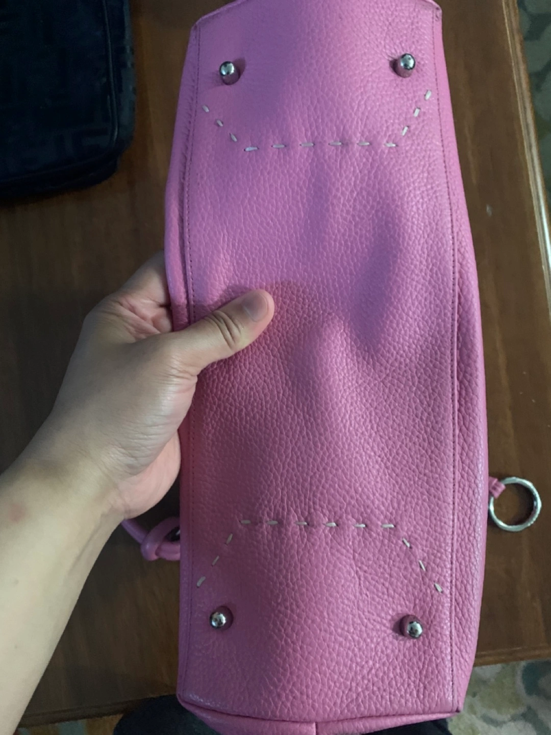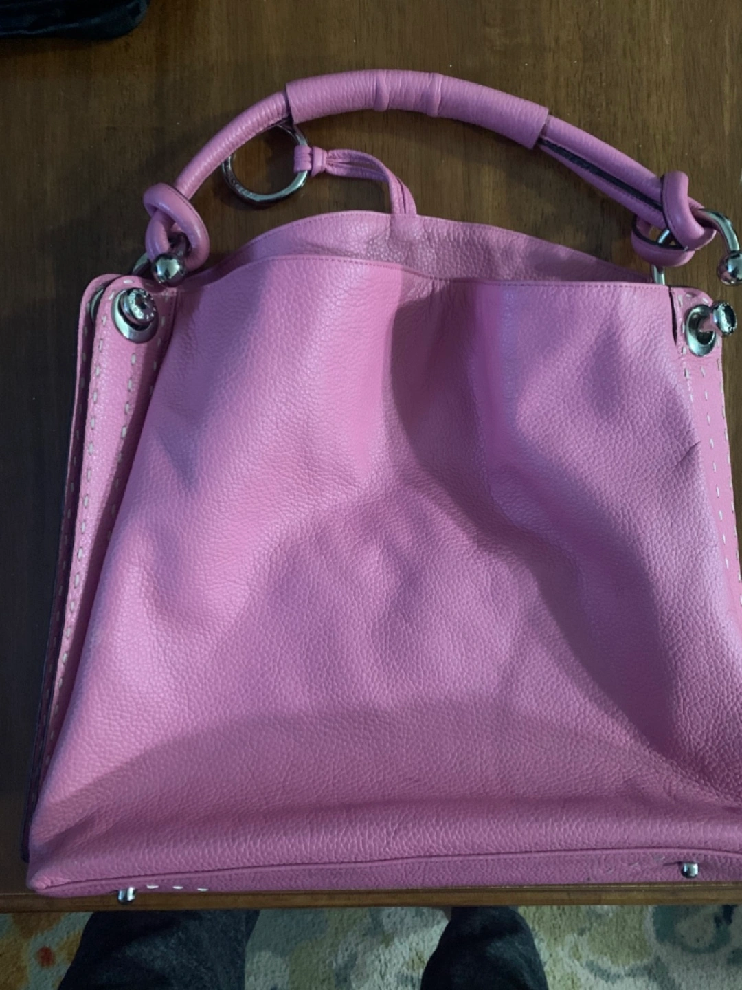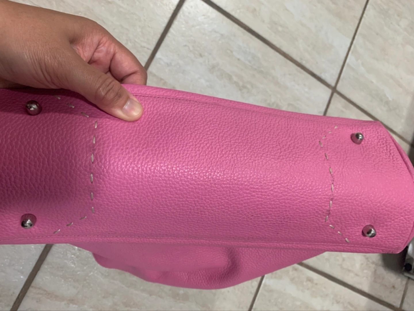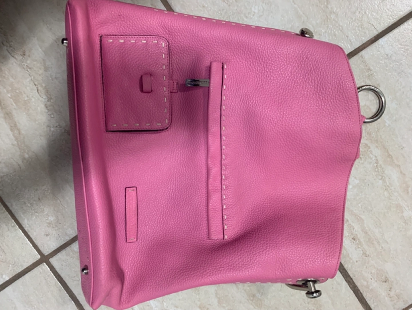 Pink handbag. Featuring a handle at the top. Handbag appears to be made of leather. Exterior pockets. A great bag to enjoy all of your daily needs in a stress free manner.