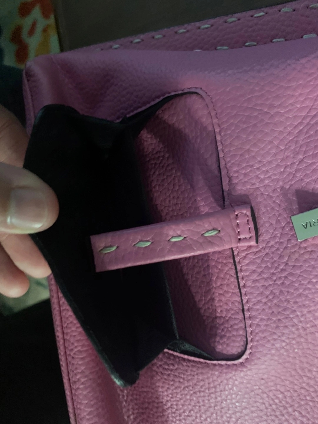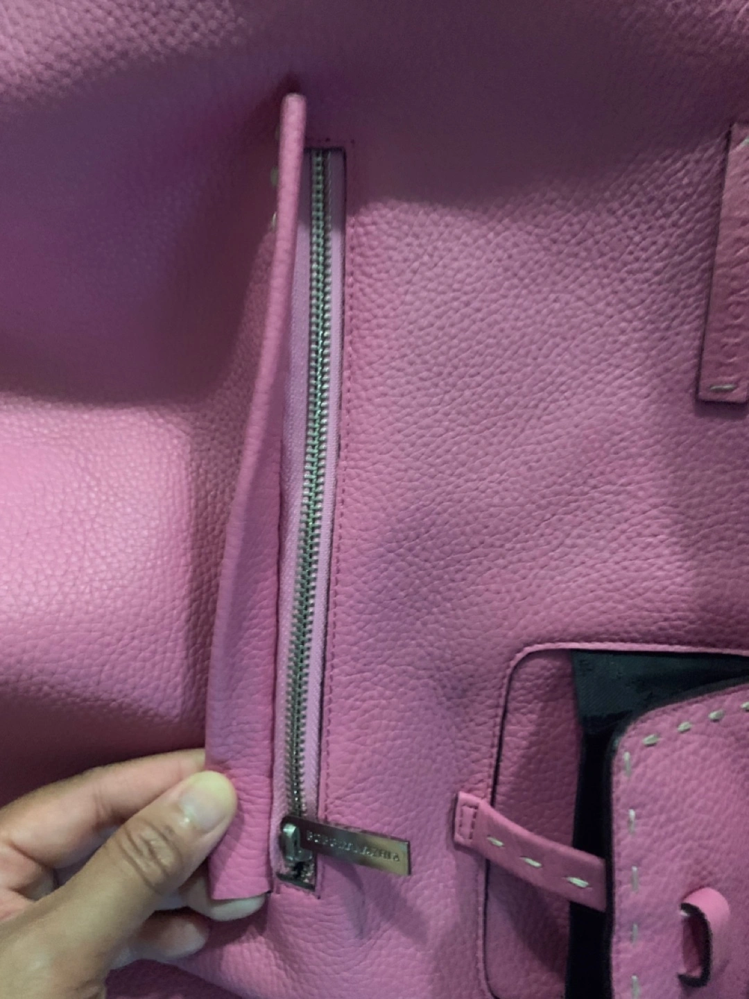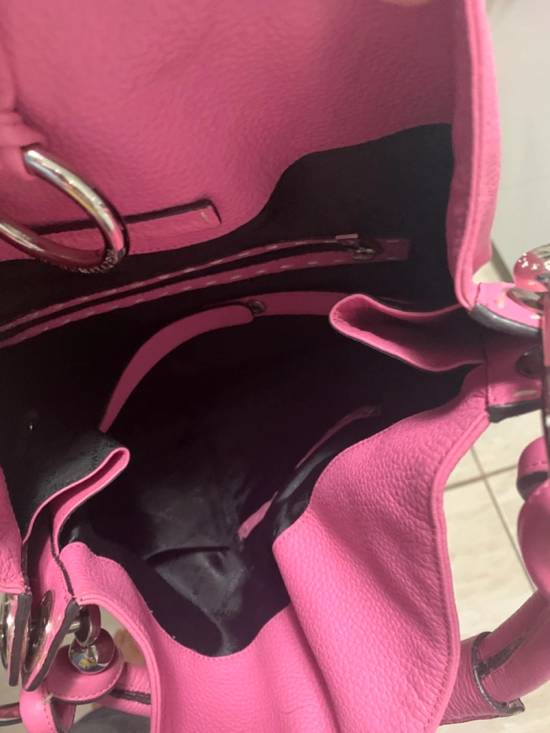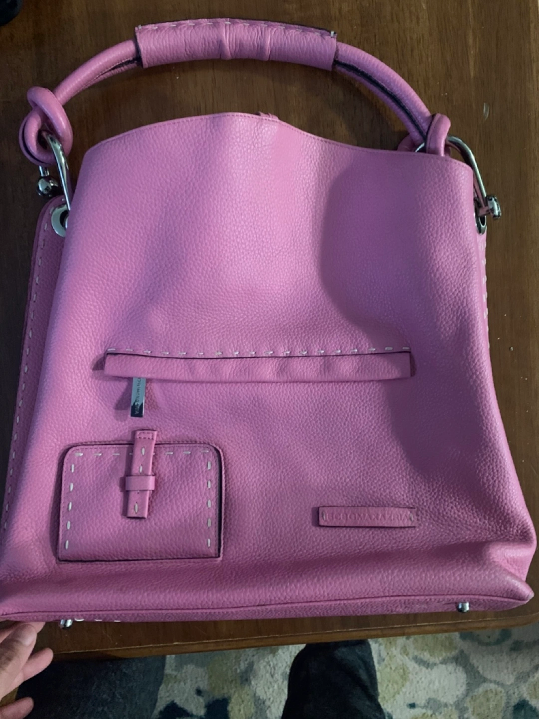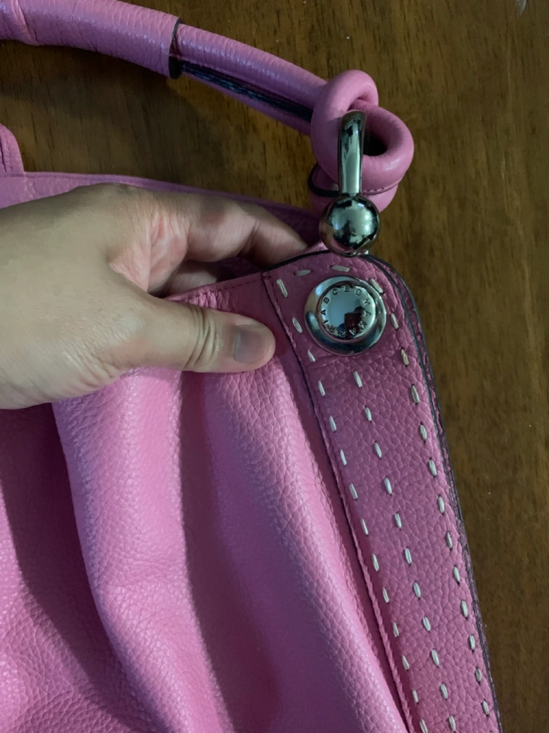 Pink handbag. Featuring a handle at the top. Handbag appears to be made of leather. Exterior pockets. A great bag to enjoy all of your daily needs in a stress free manner.