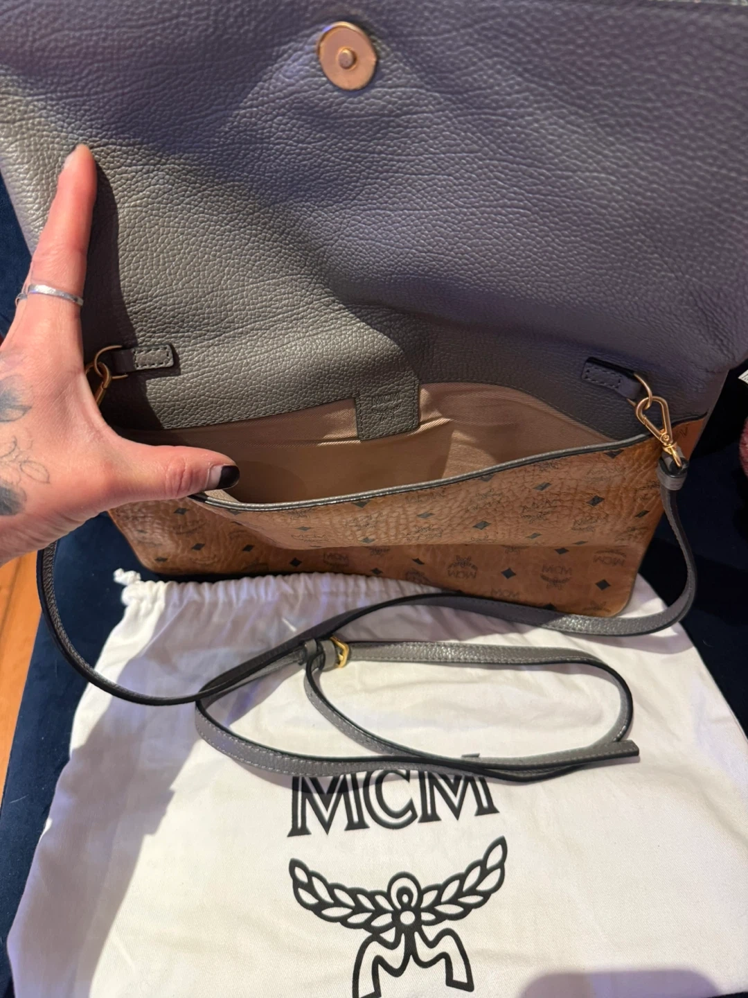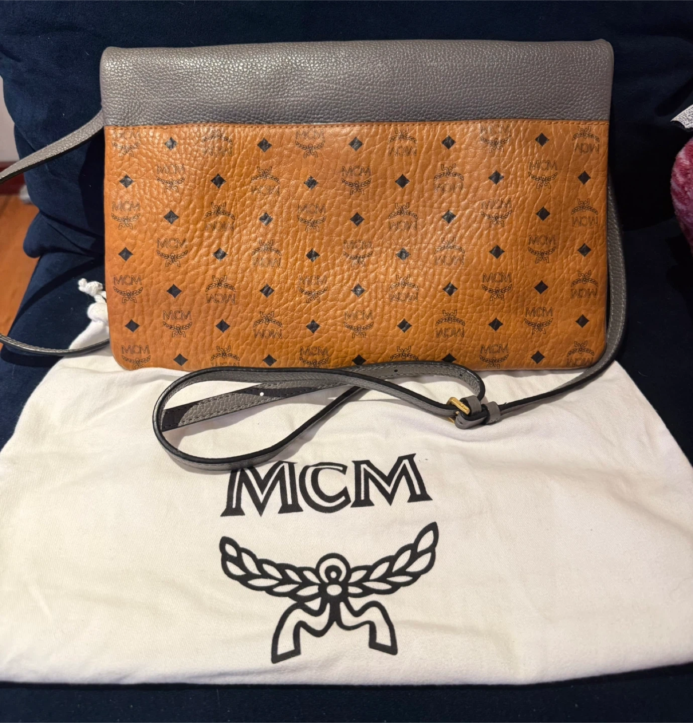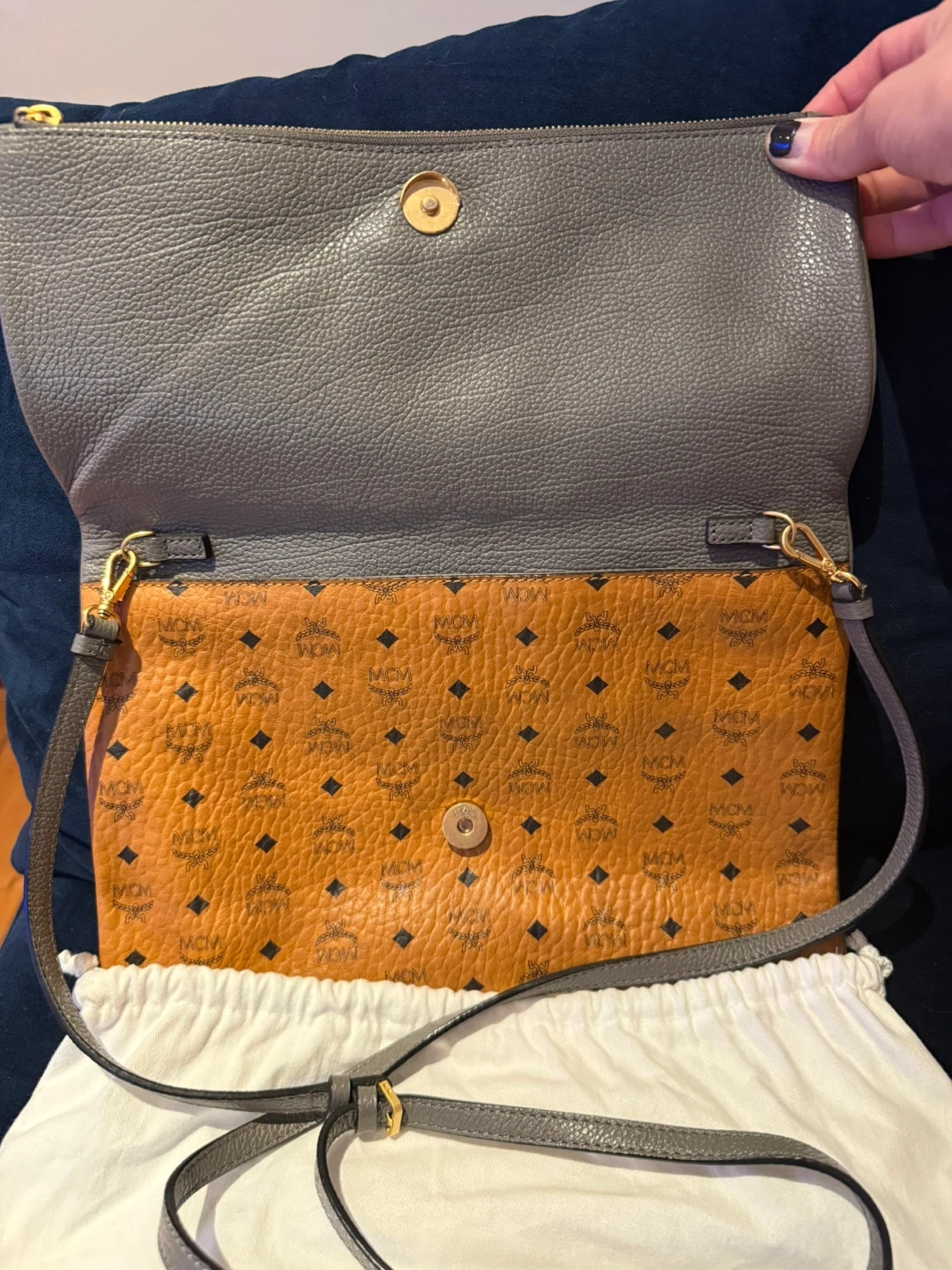 This MCM bag is a stylish clutch or shoulder bag. It features the signature Visetos print in cognac and has a grey leather flap. Includes dust bag.
