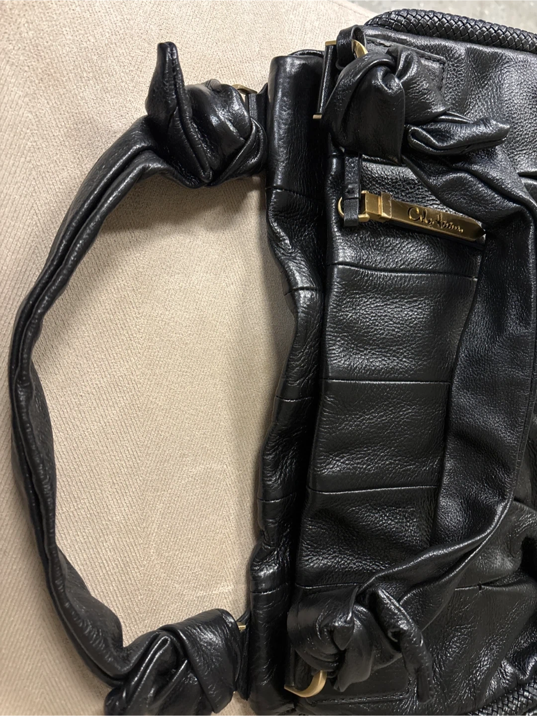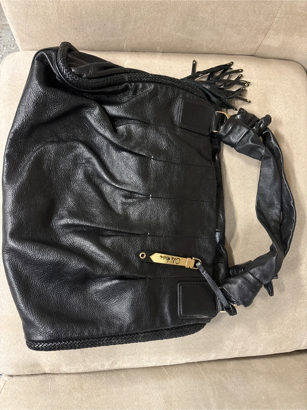 Cole Haan Black Leather Hobo Handbag with Tassel Detail