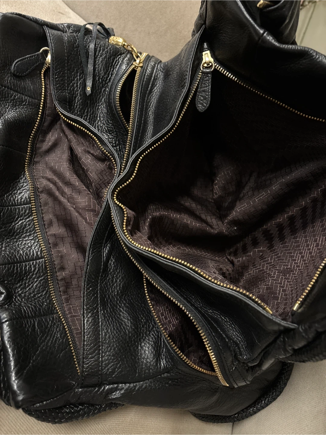 This black leather hobo handbag is from Cole Haan. It features a textured leather body with braided accents on the sides and a decorative tassel detail. The bag has 2 shoulder strap and a zip-top closure.