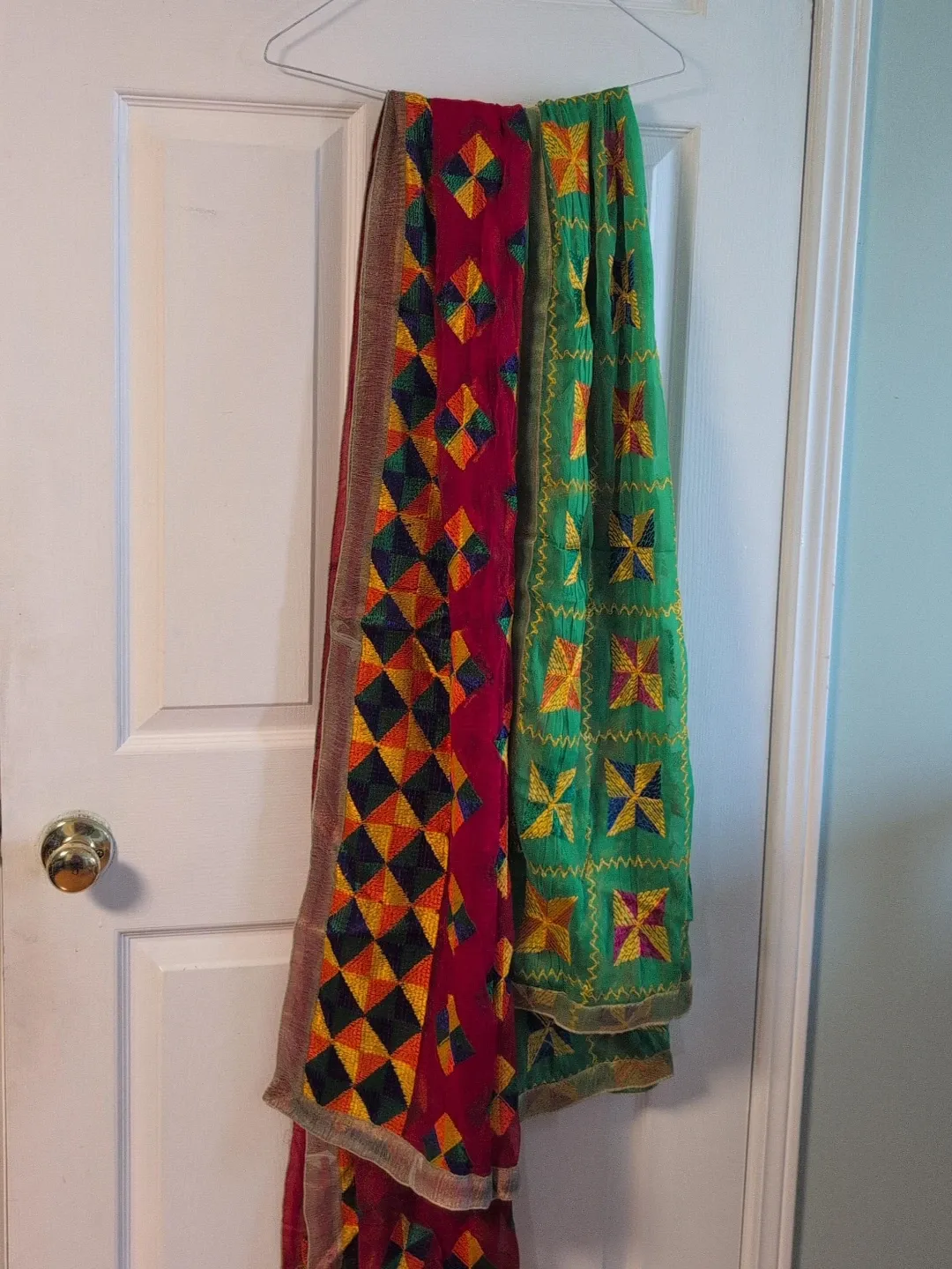 Two colourful dupattas featuring intricate embroidery. One is a deep red with diamond patterns, and the other is a vibrant green with floral motifs. Both have detailed borders and are made from lightweight fabric. These are lovely traditional accessories!