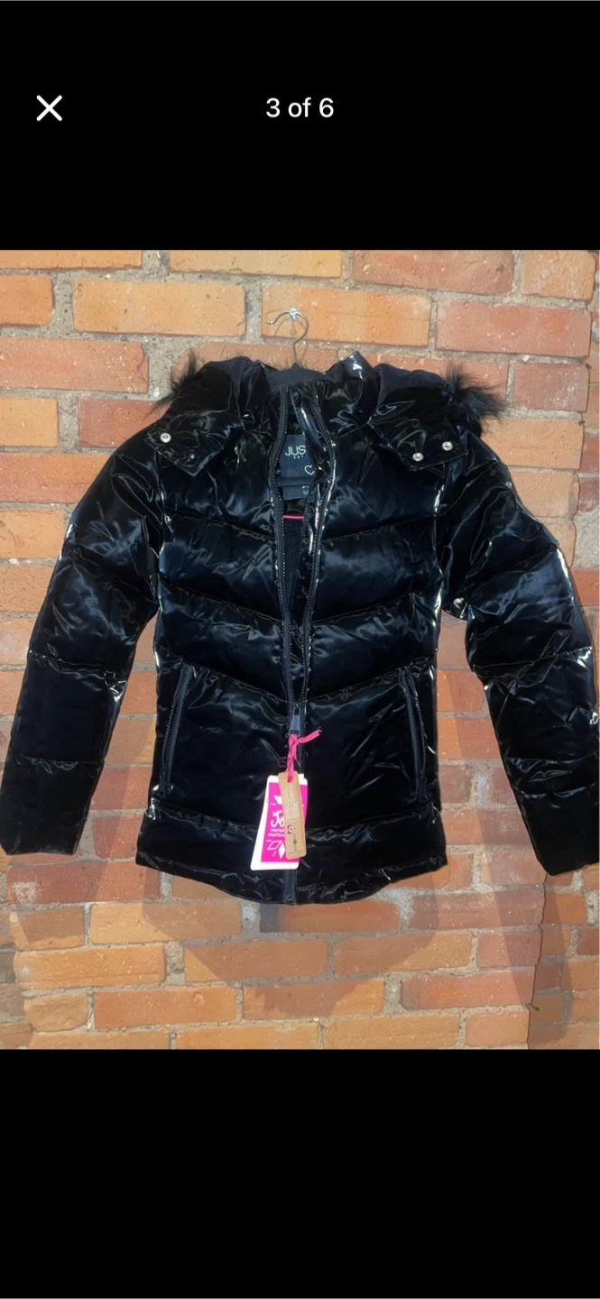 Shiny black puffer jacket with a cozy fur-lined hood. It's a stylish and warm option for cooler weather. This jacket zips up the front.missing a button ***