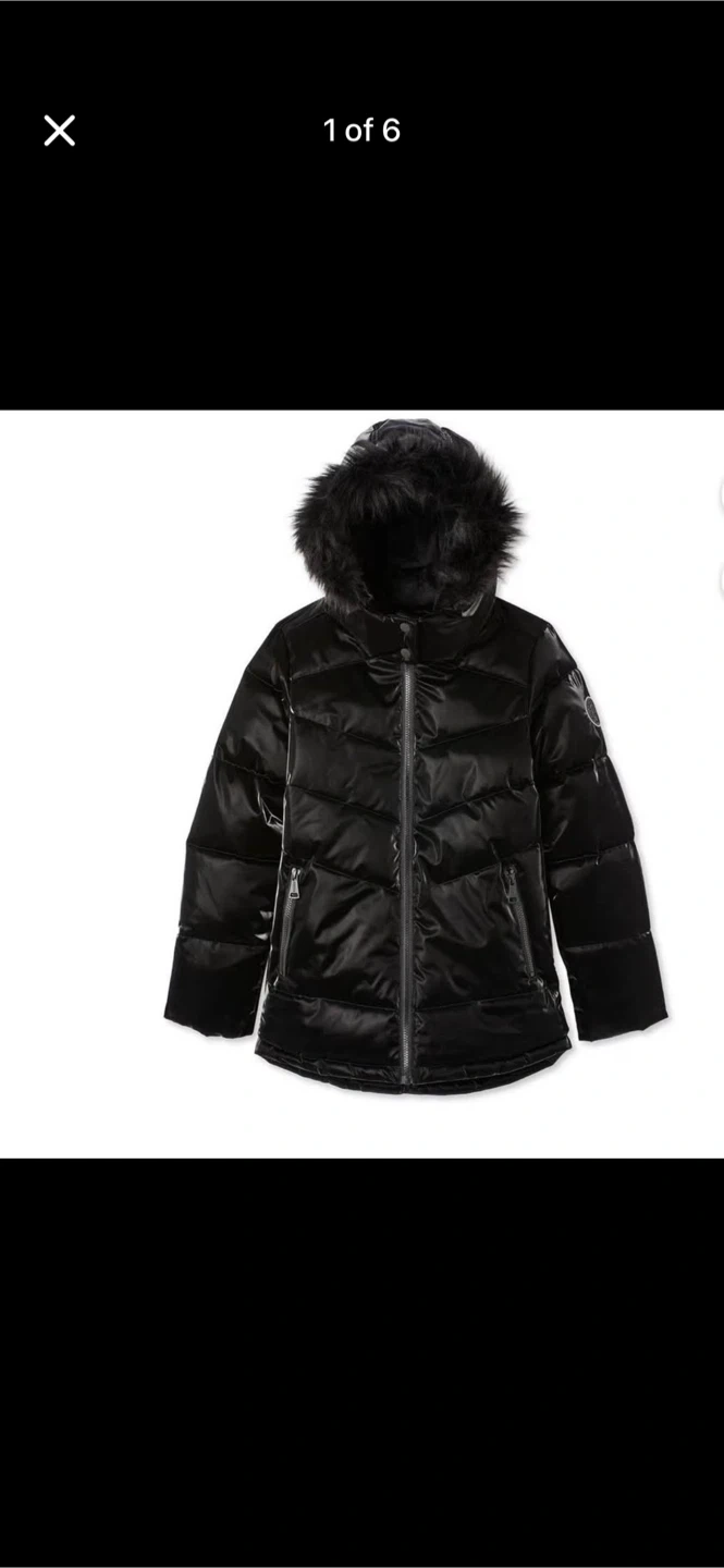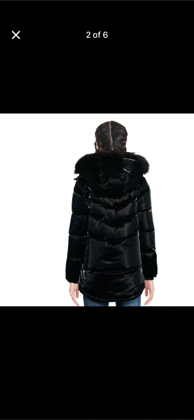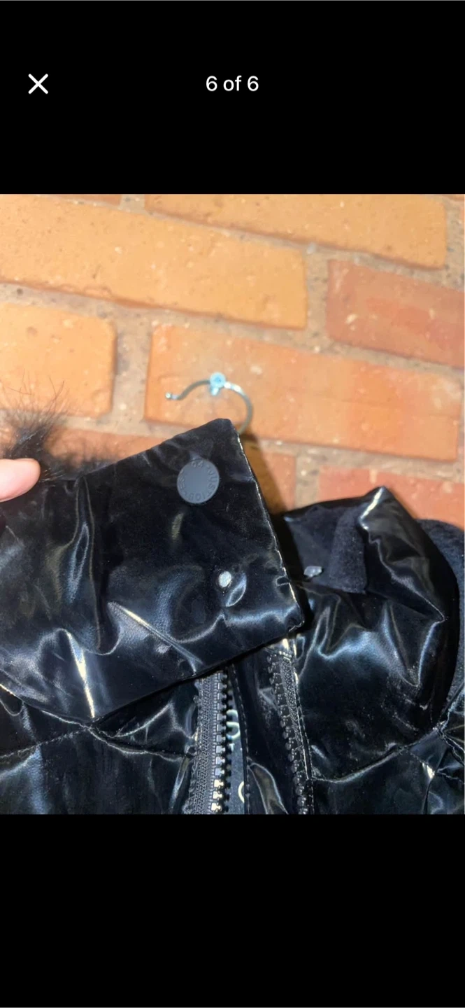 Shiny black puffer jacket with a cozy fur-lined hood. It's a stylish and warm option for cooler weather. This jacket zips up the front.missing a button ***