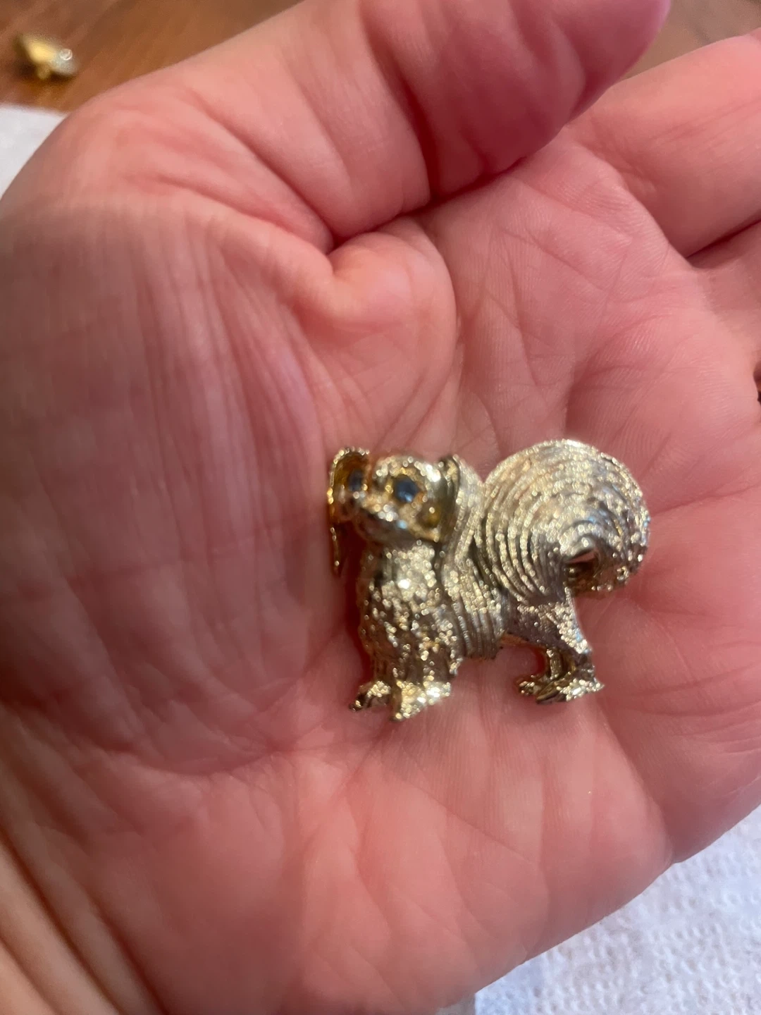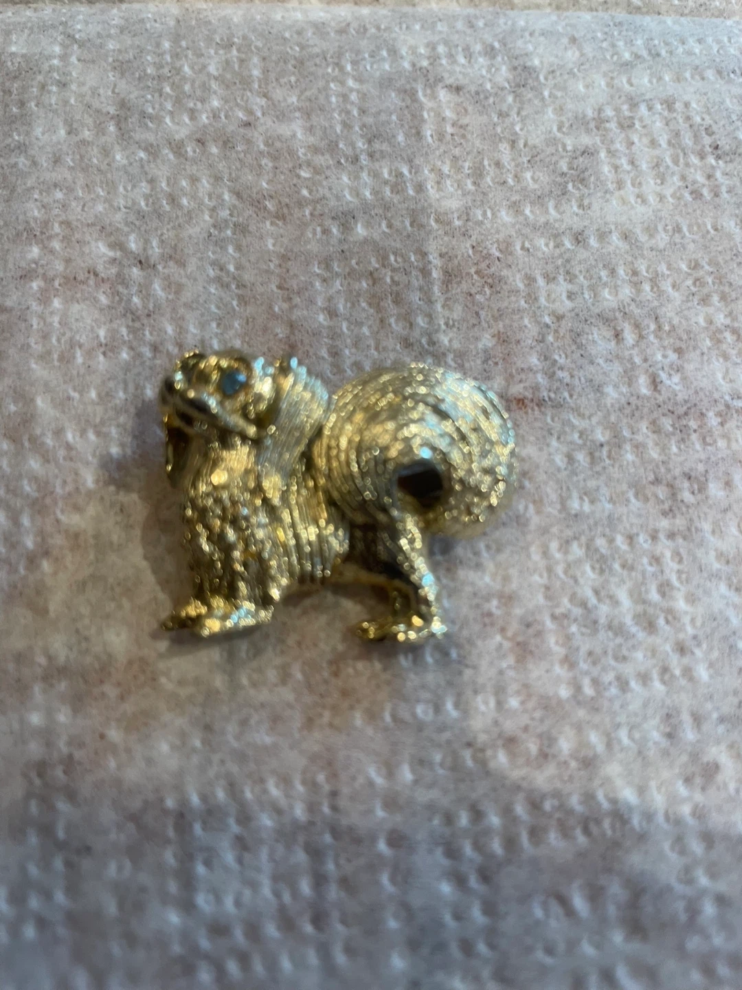 A charming vintage gold tone pin crafted in the likeness of a fluffy dog. It has sparkly blue gem accents for the eyes. This pin would make a lovely addition to any lapel or accessory!