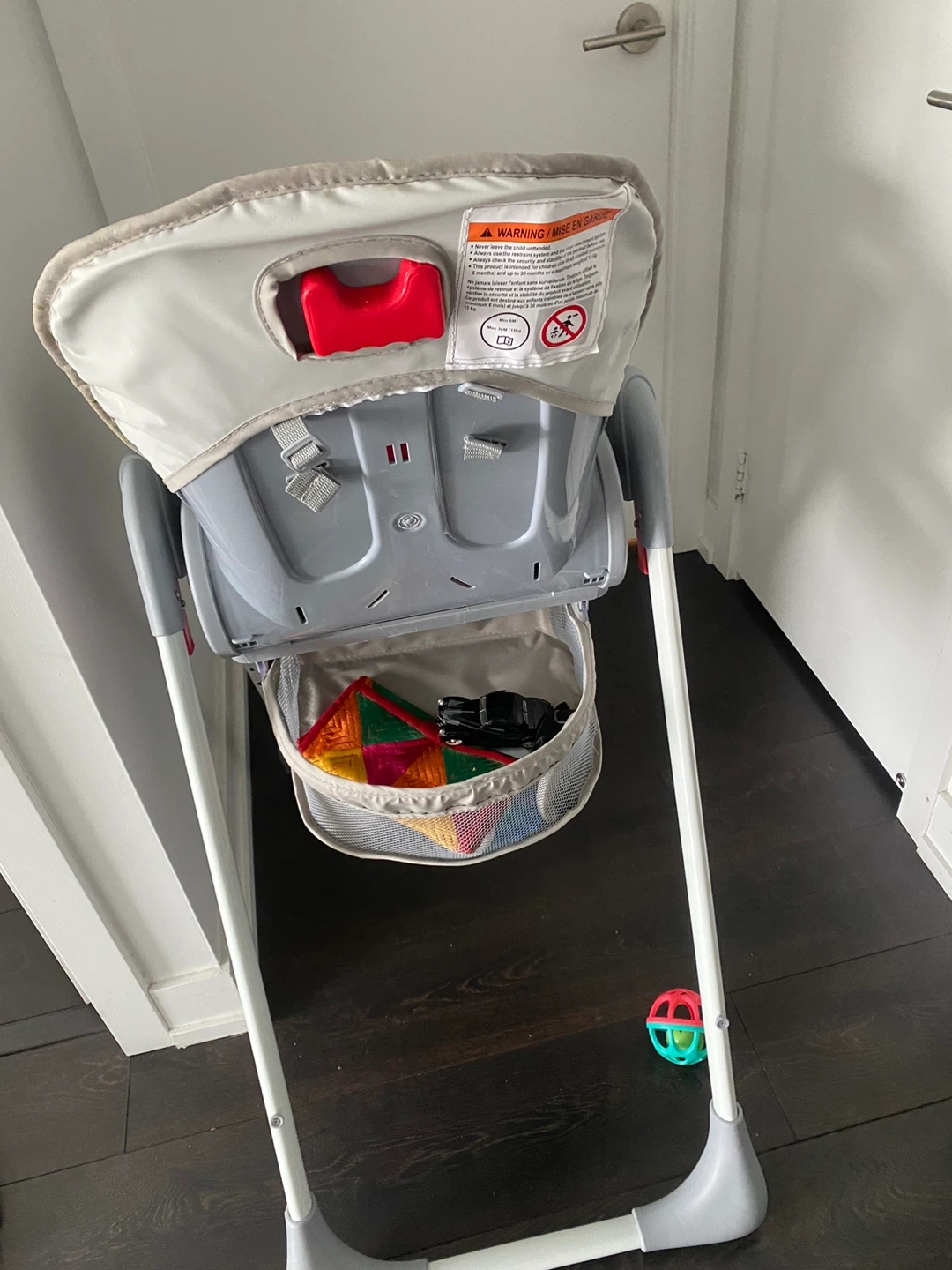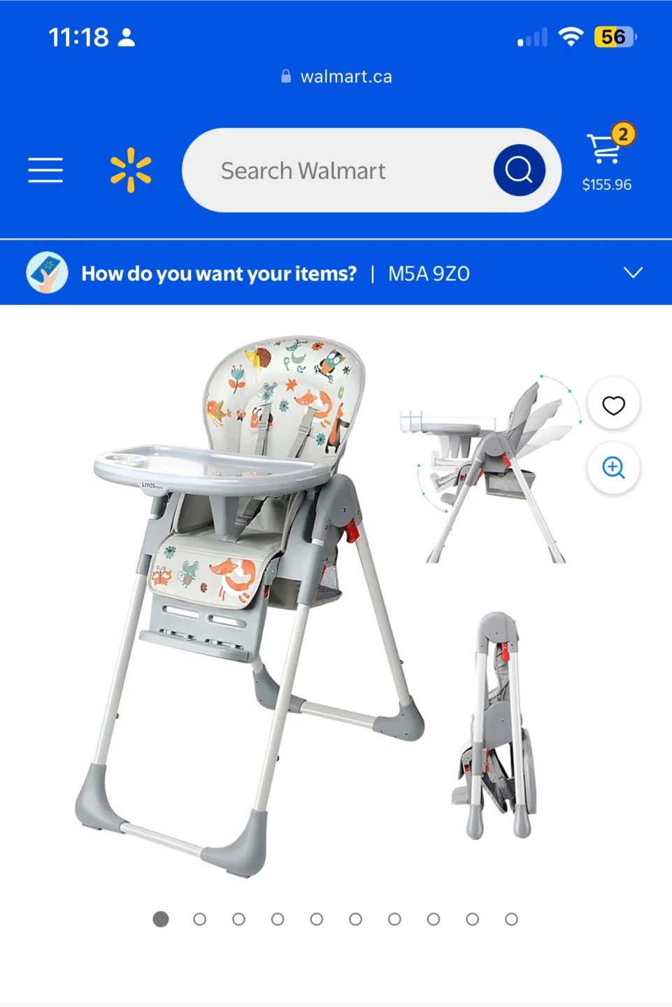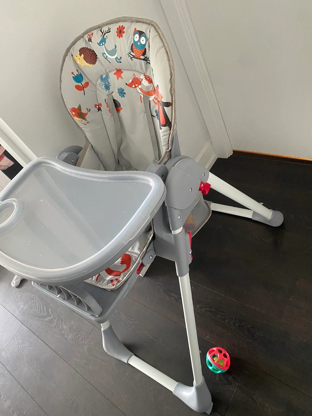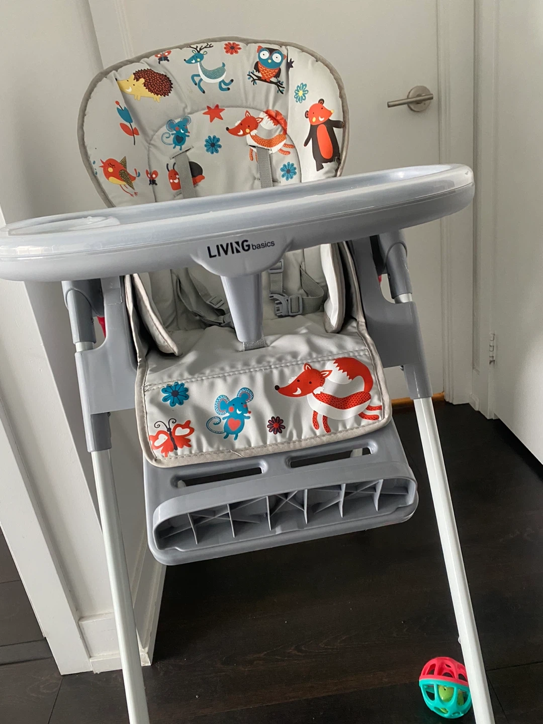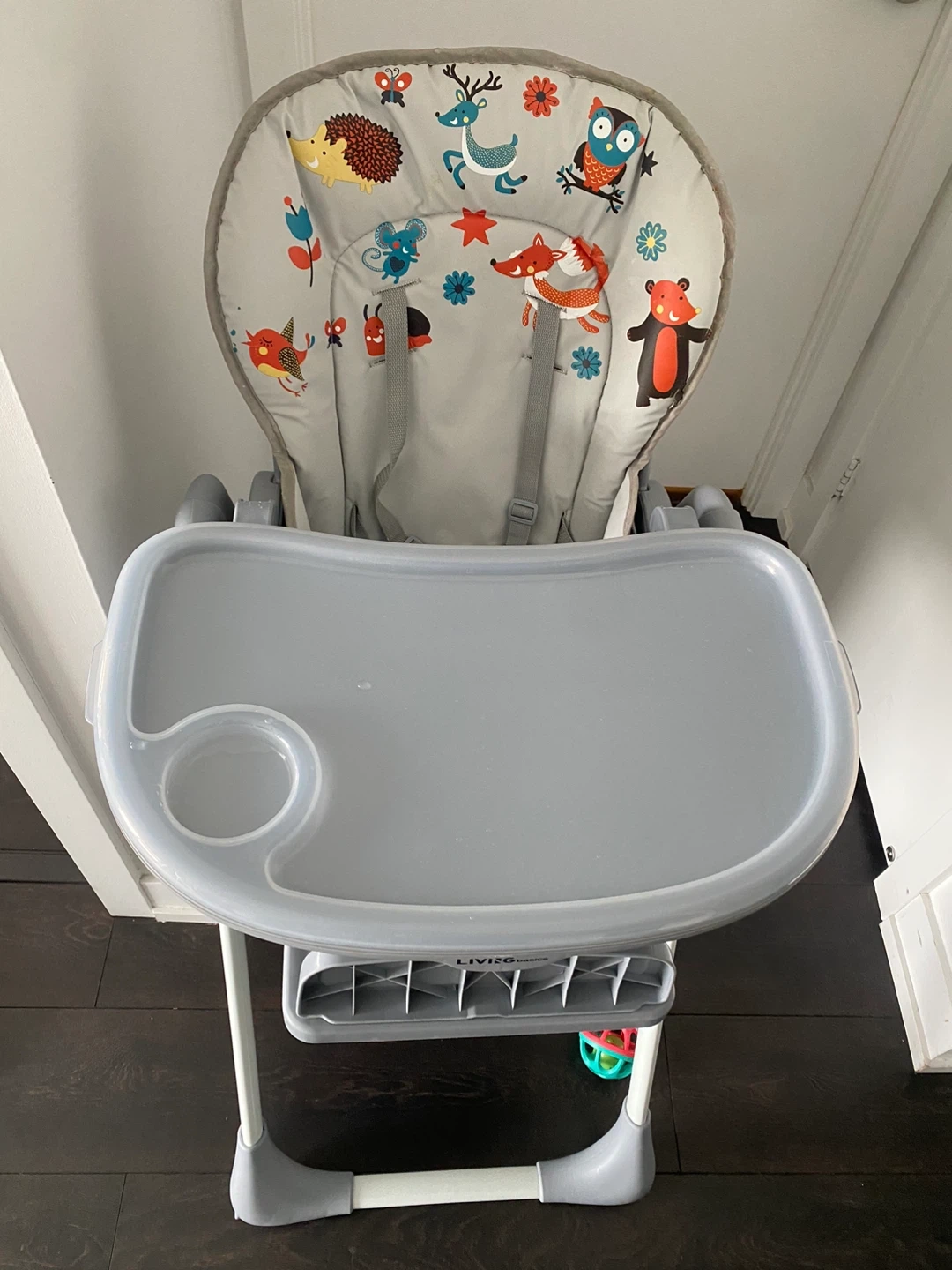 This Living Basics high chair features a cute forest animal print on the seat cushion. It has a removable tray with a cup holder. It's designed for easy cleaning and a comfortable mealtime for your little one. Great for starting solids!