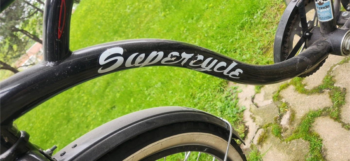 The images shows a Supercycle Classic Cruiser 26-inch comfort bike. This type of bike combines vintage charm with modern comfort, making it suitable for leisurely rides on pavement and hard-packed trails.