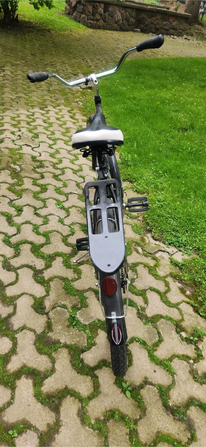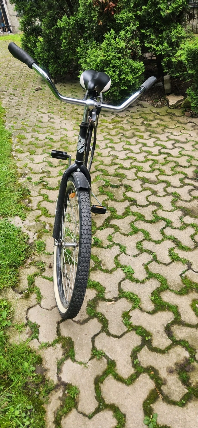 A black bicycle with white tires and a rear rack. It features a comfortable seat and swept-back handlebars. Riding this bike along the beach can be very relaxing.