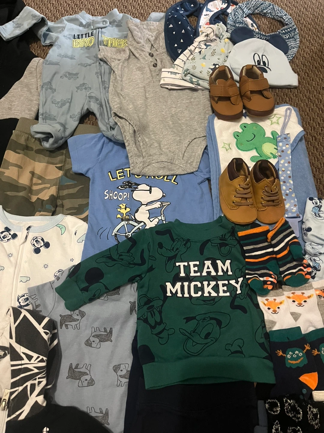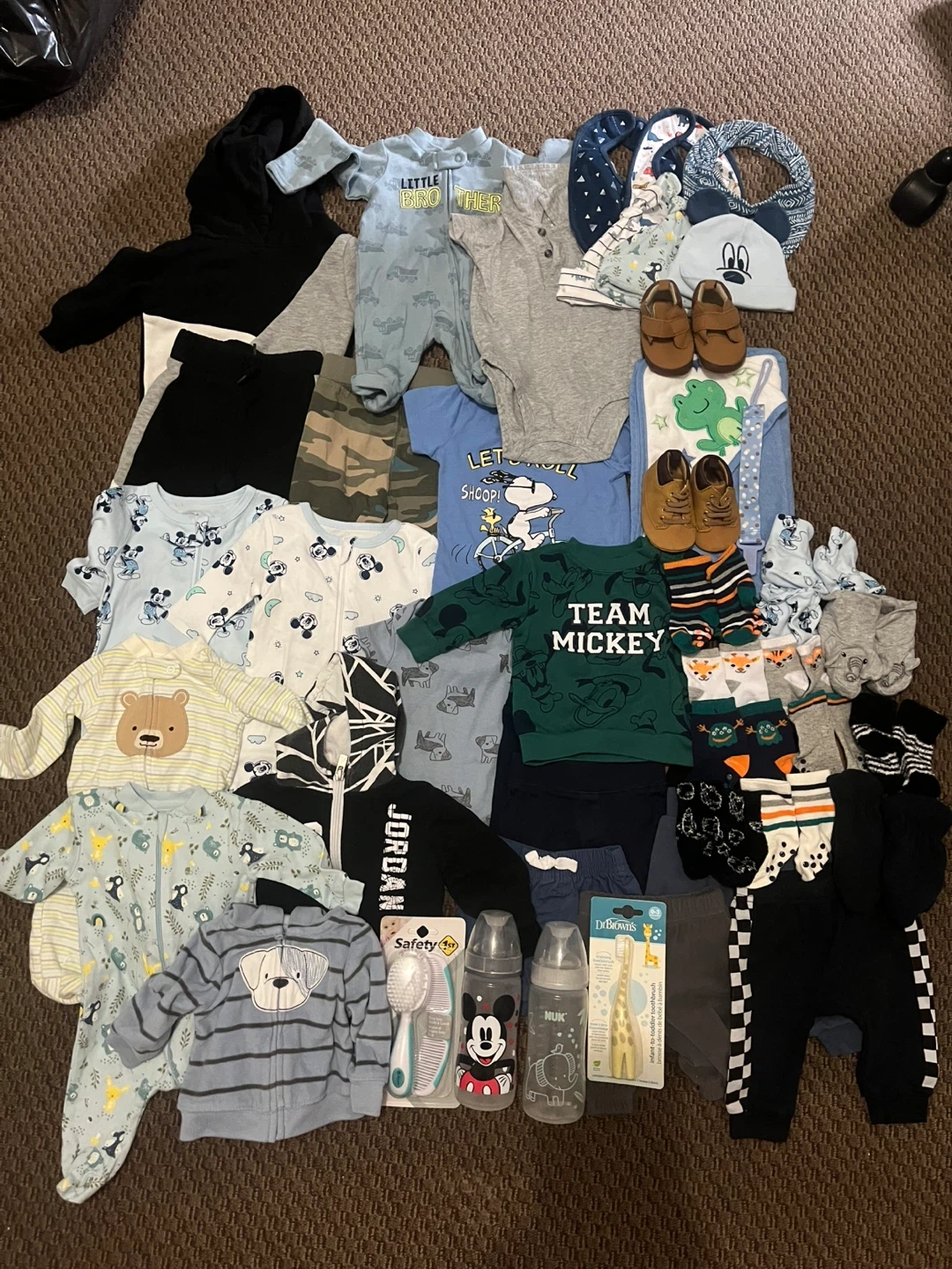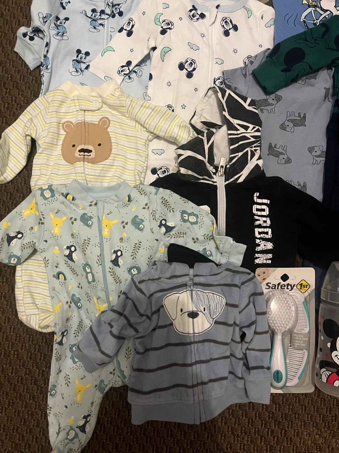 This bundle includes various baby clothing items like onesies, sweaters, socks, and pants. It also contains two baby bottles, a baby hairbrush and comb set, and a toddler training toothbrush. Perfect for keeping your little one comfy and supplied!