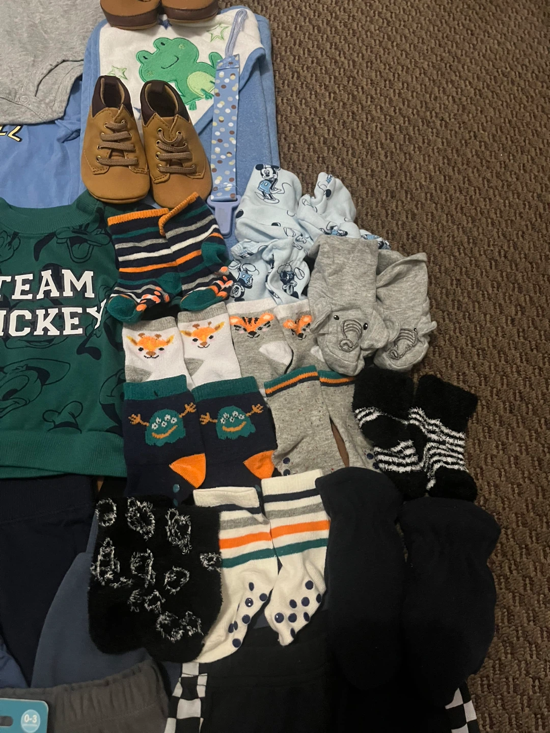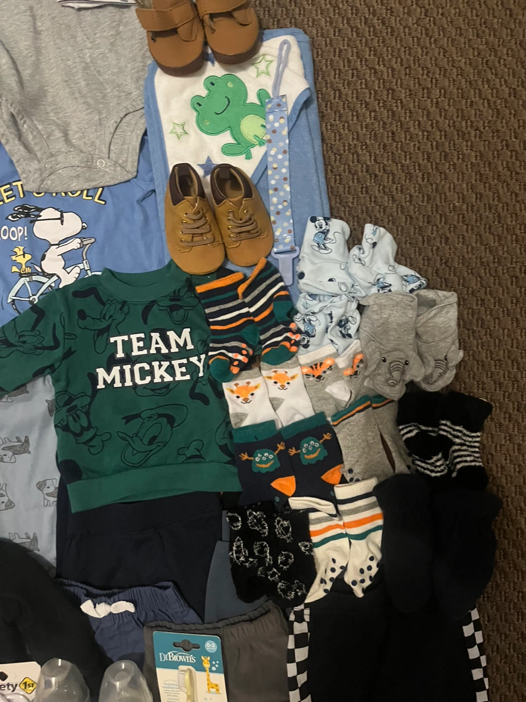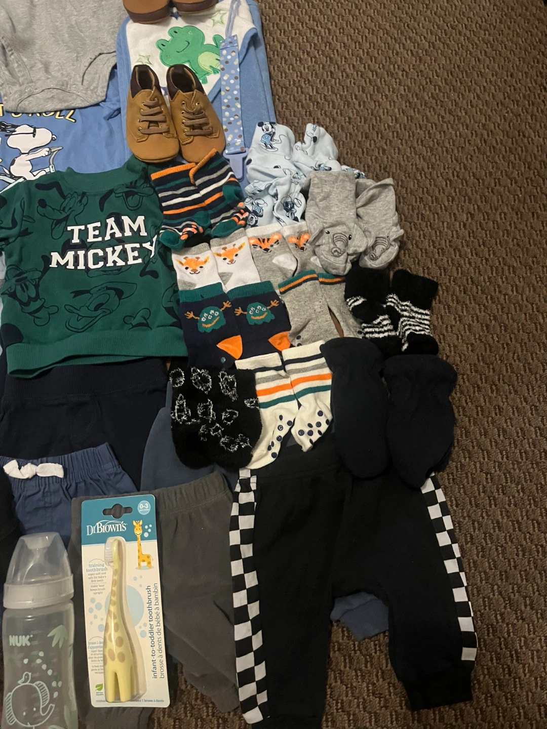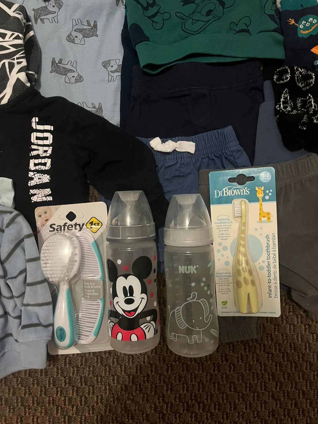This bundle includes various baby clothing items like onesies, sweaters, socks, and pants. It also contains two baby bottles, a baby hairbrush and comb set, and a toddler training toothbrush. Perfect for keeping your little one comfy and supplied!