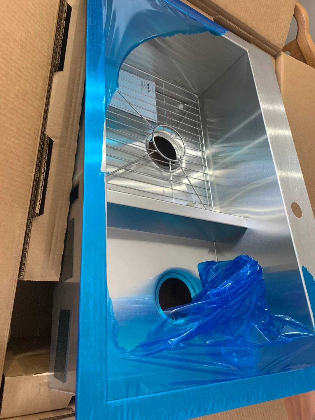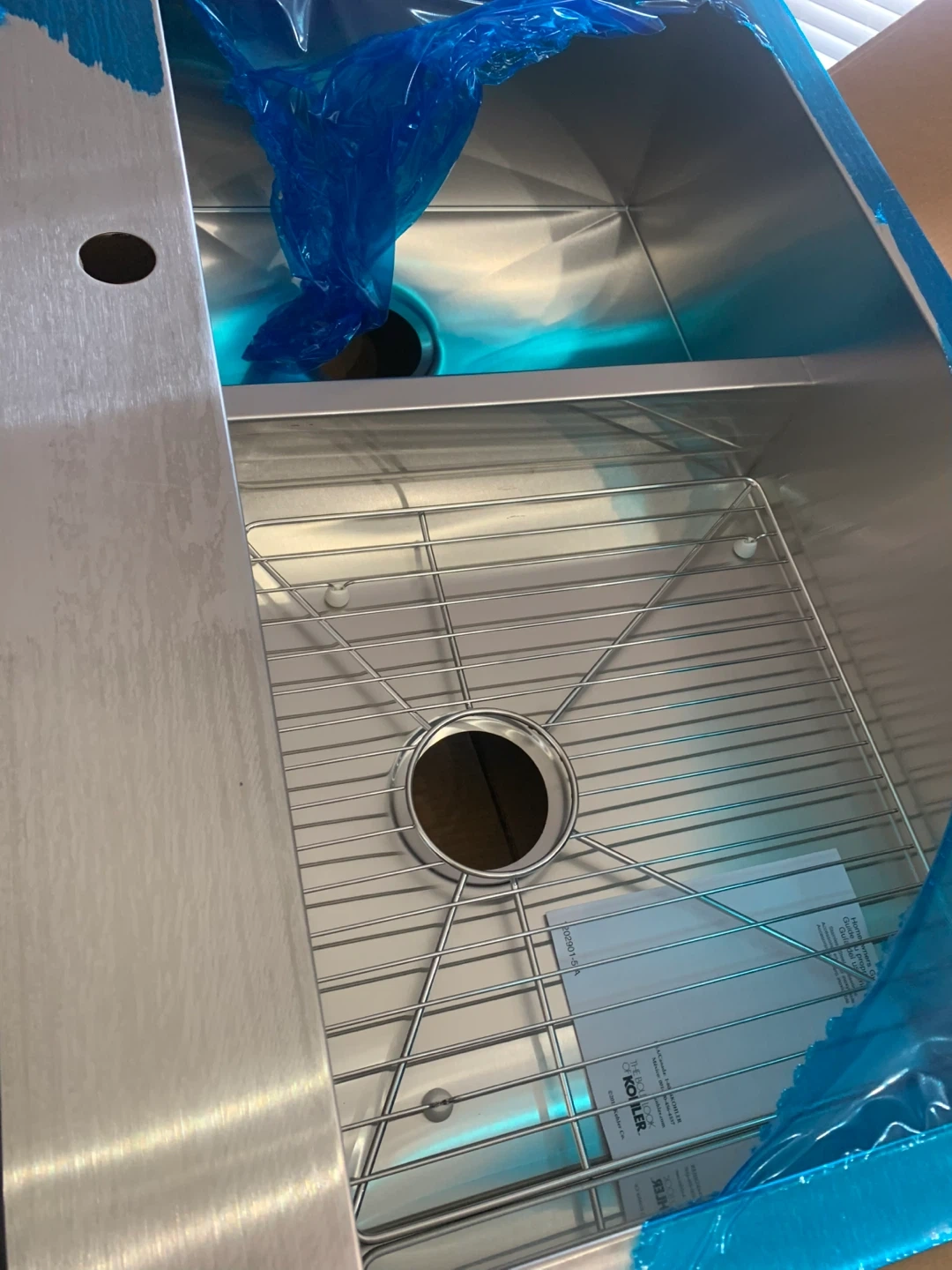 This is a new Kohler stainless steel top/ undermount kitchen sink. 33” It includes a sink grid and mounting hardware. It's made of durable stainless steel and features a spacious design.