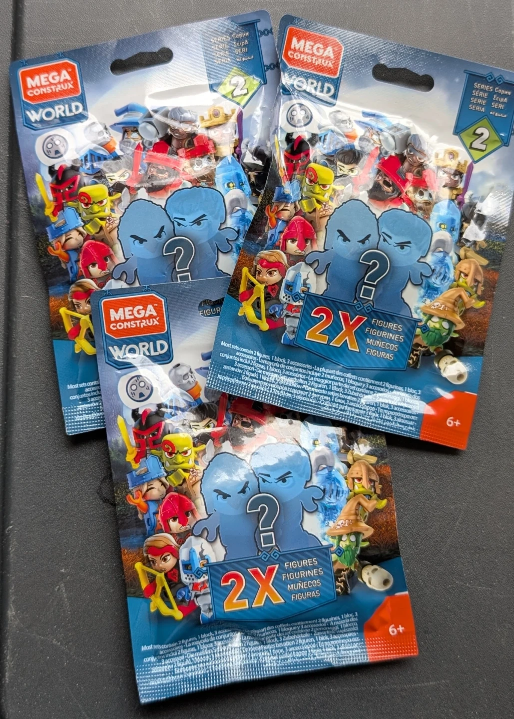 Three Mega Construx World Series 2 blind bags. Each set contains 2 figures, 1 block, and 3 accessories. These are blind bags, so the figures are a surprise! Great for collectors and kids who love building.