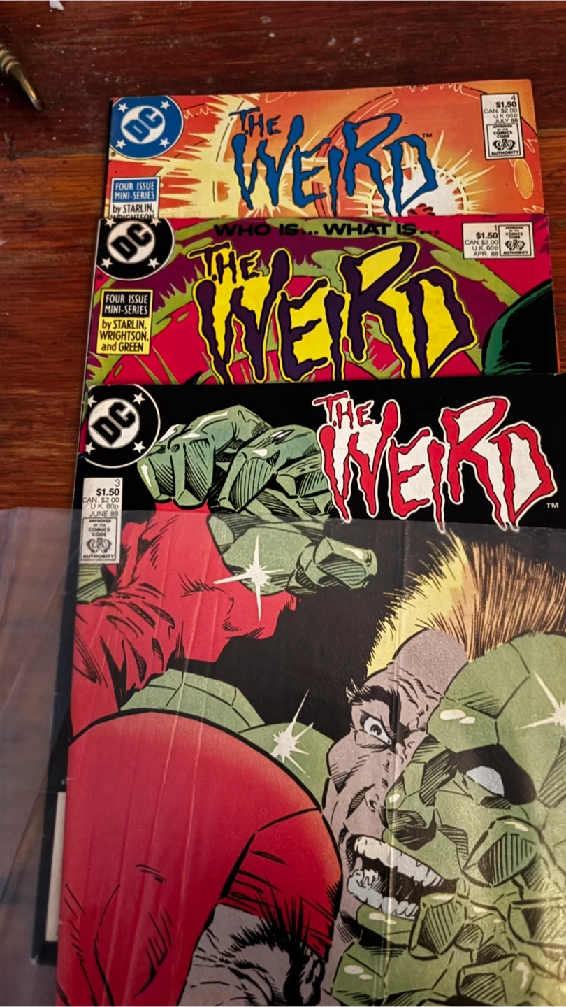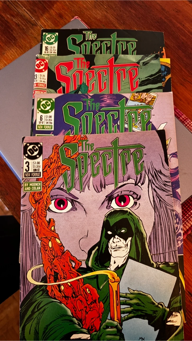 A collection of various Marvel and DC comic books. Titles include The Thing, The Spectre, The Weird, Omega Men, Dino Riders, The Phantom, and more. Perfect for comic book enthusiasts and collectors.