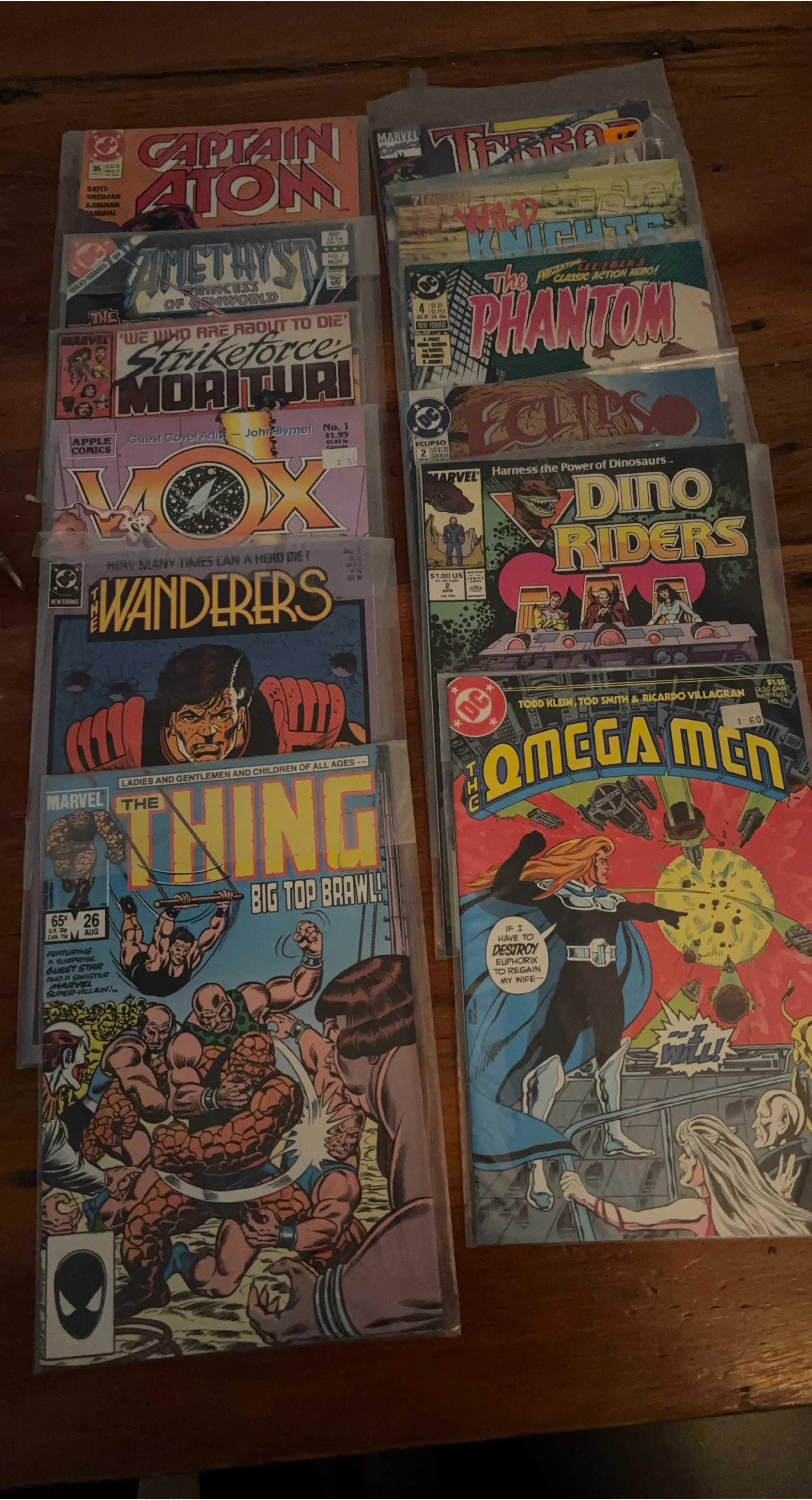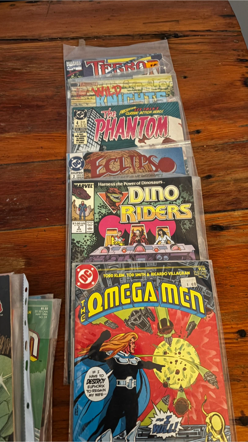 A collection of various Marvel and DC comic books. Titles include The Thing, The Spectre, The Weird, Omega Men, Dino Riders, The Phantom, and more. Perfect for comic book enthusiasts and collectors.